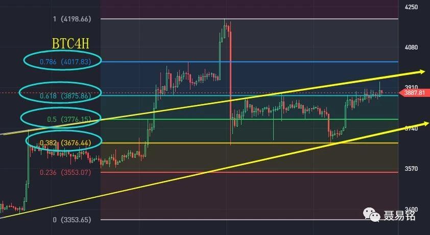 聂易铭:3月8日晚间主流币行情分析 大饼在下午突破突破了前期阻力3900的,但是并没有突破,基本符合上篇文章中的走势,但是随后的回调中,仅仅到达3870附近,回调修正并不充分,币价发生较大变化的可能行不大,此外上行趋势有楔形整理的趋势,缩口开始缩小,币价的波幅也在持续减弱,下方在斐波那契61.8%的位置3875开始呈现一定的支撑,接下来的行情在3875-3950波动的概率较大,波幅小而风险大,建议这个时候最好观望, 以太坊位置在138一线胶着,目前快来看,K线走势已经趋于平缓,短期上方压力位140-142,并没有随着下午大饼的拉升而突破,ETH下午的成交量持续低迷,在大饼突破3900的情况