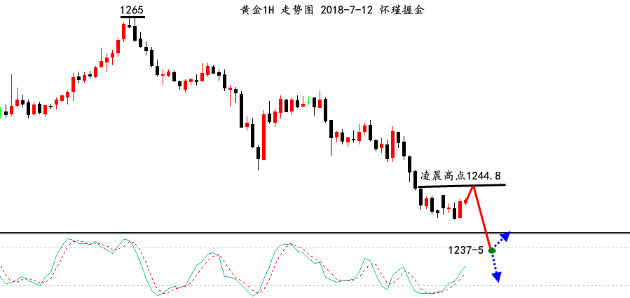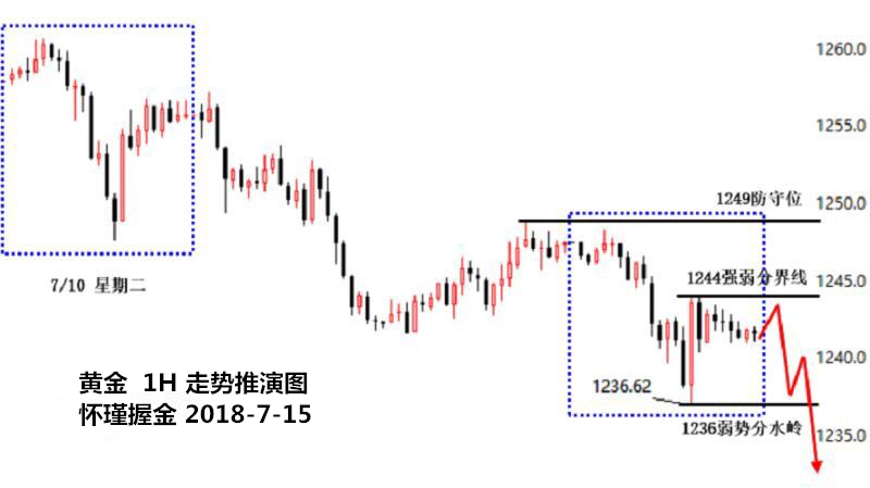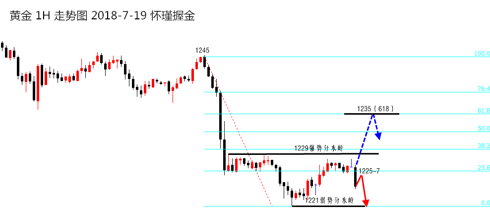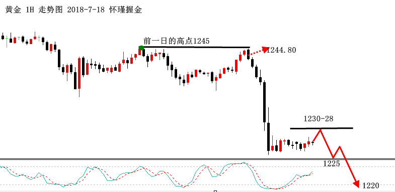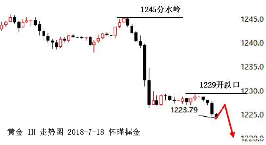 文 / 怀瑾握金 静若处子动若脱兔,要做到如此,一定需要坚忍不拔的毅力和心态。多数失败者都是在最后一刻选择了放弃。因此,成功的道路上显现的并不拥挤,因为坚持的人并不多! 周二,黄金开盘快速下跌,至1237附近止跌反弹,午后小时线连阳上涨最高位1244.8,并没有突破前一日的高点,始终在1245下方运行,与前一日白盘的行情极为相似,都是弱势上涨不延续。 美盘阶段因美联储主席鲍威尔对美国经济的评估乐观,且淡化了贸易局势对货币政策前景的影响,美指强势上涨,白银先行破底,黄金随后大跌,最低下跌至1225.8。 周一的震荡延续至周二,怀瑾昨日的晚评就说过,低位震荡极易下跌破位,行情还是如预期下跌,布局