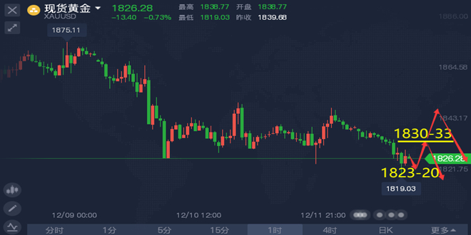 现货投资中一笔成功的交易,并不是简单的做多做空,而是形成一套完善的风险交易原则,当风险远远大于收益,即使有利润的空间,单子做进去有什么意义呢?市场上,盈利最大的敌人就是风险,很多人对于风险没有一个清晰的理解,可能只是觉得,风险就是行情走势反向的概率,这是最简单的风险理解。其实对于风险,很大一部分是外在因素形成。为什么做投资不能一个人单打独斗,因为你不可能随时关注风险的变化,把控市场的动向,盈利一时,难以保持盈利。而作为老师,更是需要和投资者进行互相配合,互相理解互相信任的走下去! 现货黄金周四(12月10日)波幅较前一日减小,震荡交投于1828-1849区间。周四亚市开盘走小幅回落1833附
