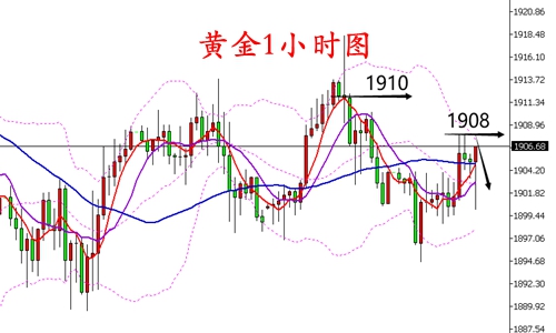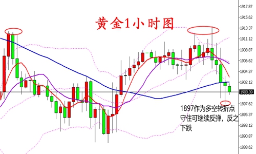 在这个多空难测的市场上,仍然是有人赚的到钱,也有很多朋友做的不够理想,在该做空的时候,怕冲高,该做多的时候,怕回落,其实这就是人心,这就是技术,人心就是最大的技术。有时候你会知道,真正影响你的不是价格波动,而是心中想象的东西太过于多。下跌行情不言底,上涨行情不言顶,要善于观察并且等待机会的降临,能看懂的市场行情总是可遇不可求的,不要交易那些你无法弄懂的市场行情,也不要以为必须每个波段都进行交易。 现货黄金周四维持震荡走势,亚盘和欧盘走势疲软,一度跌至1889一线日低,美盘收复所有失地,报1908.4美元/盎司。周四早间金价短线维持低点1898一线窄幅维持,亚盘交易时间金价最低触及1892一线
