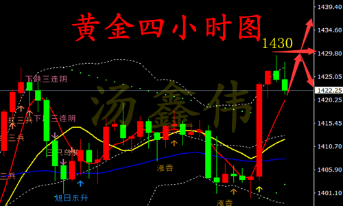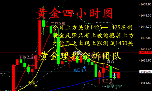 投资之路漫长,随波逐流者多之!然不谋全局者不足谋一城,市场风云,变幻莫测,定其心,观其势,谋定而后动,不乱于心,不困于情,运筹帷幄之中,方能决胜千里之外。怀疑能过滤风险,但也同样能错失机会,要想抓住机会,就要勇于尝试。若胸无大志,纵使贵人相助,也终将难成其事。作为一个合格的投资者需要谨记,大部分时间应该以观望为主,耐心等待最佳的时机,需要避免频繁进场,操作上不要试图抓获所有波幅,也不要奢望对每一段行情都判断正确,应该少而精! 黄金行情分析: 黄金当下处于横盘,重点关注1420—1430的破位情况;当下消息面平淡,技术面横盘震荡区间1423—1430之间持平。上周四周五的阴阳循环并列,整体高位