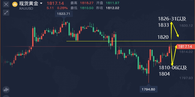人生总是在做选择,也总是在等待结果,道路不可能也是一帆风顺,总会有坎坎坷坷,平庸不是每个人都追求的目标。投资市场,也是如此,不可能顺风顺水,而暴利都是每个人追求的梦想,但路途总会有各种诱惑和陷阱。走惯了震荡,总要被单边洗盘扼杀,这是市场的规律。面对人生,我们在做选择,坎翻不过去,可以绕道,河淌不过去,总要借助别的办法,而市场,也是如此,不要一味追求操作,有些行情,你看见利润,但未必能获取利润,做自己看的懂的行情就是最好的交易方法。 黄金行情分析: 周一现货黄金整体呈探低回升走势。早间亚市小幅上升至1817区域附近后出现受阻回落一直延续至欧市盘中。盘中走势接连下破1810关口和1804上周五起