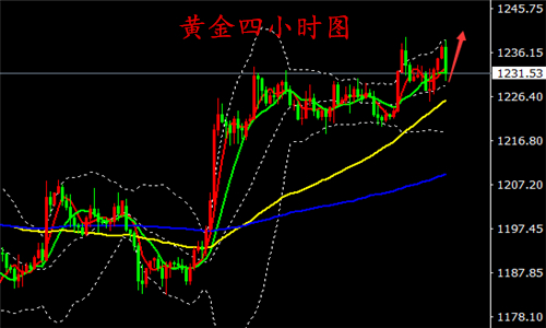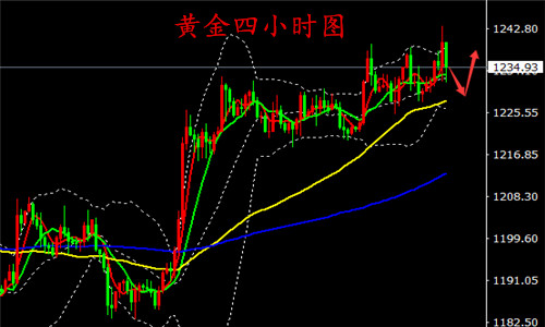 解析上周黄金上涨受限原因: 刚刚过去的一周,国际现货黄金艰难上攻,由于全球股市尤其是美国股市表现较差,在避险情绪的帮助下,顶住强势美元的压制,一度刷新三个月高点至1243.44美元/盎司,为7月17日以来新高。收报1234.93美元/盎司。周线录得四连阳;技术面正好触及周线布林线中轨附近阻力,分析师汤鑫伟觉得下周国际现货黄金走势依然存在极大的变数。上周美国的经济数据比较乐观,给美元提供支撑,限制国际黄金的上涨,但美国三季度GDP数据后,美元指数在创下两个月新高后有所回落,但周线依然录得0.79%涨幅,这是国际黄金本周涨幅受限的主要原因。 分析黄金后市市场走向: 汤鑫伟老师分析其实对于当前黄金