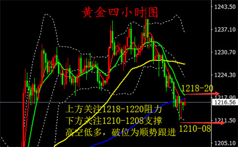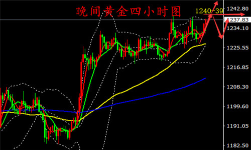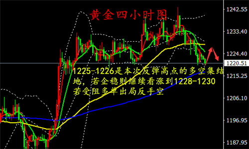 隔夜,很多投资者都认为欧洲央行德拉基放话会严重影响黄金上行,但鑫伟认为金价短线陷入弱势震荡,央行按兵不动,经济弱于预期,数据出炉后欧元先涨后跌,打了一圈太极,而昨日美盘,真正影响黄金下行的因素是,美盘美股高开,恐慌情绪有所减退导致黄金上涨动力暂时减退,美国初请、耐用品订单以及成屋销售等数据的公布,美元指数持续攀升,而欧元最后的走空,美指走强是影响黄金上涨没起来的关键,目前1230和1228还在,昨日日线收阴,今日继续看多头做最后抉择。 周四因股市企稳削弱了避险情绪,且美元再创8月17日以来新高96.75,金价承压由日内高点1239.06美元/盎司一度跌破1230关口。另外,美元强势归来,黄金