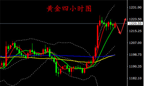 昨晚受欧美股大涨影响,国际现货黄金冲高回落,昨夜金价触及1232.33美元高位后回落,跌破1230和1225短线支撑位,最低至1223.35美元/盎司,美盘报收于1224.82美元/盎司。隔夜黄金冲高回落,日线整体收跌,日线上收取一根小阴K线。今日早盘现货黄金开在1224.07美元/盎司,最高1225.72美元/盎司,亚市金价呈振荡下跌态势,亚市高点日线阻力,下方支撑留意1220关口,跌破继续看1215一线,短线金价弱势调整中,对于今日黄金行情,汤鑫伟分析认为,昨日黄金上涨未能破高,行情显然回归震荡调整,下方支撑前期低点1215-1216,亚盘回撤继续看跌,分水岭为早盘的高点,反弹突破则意味