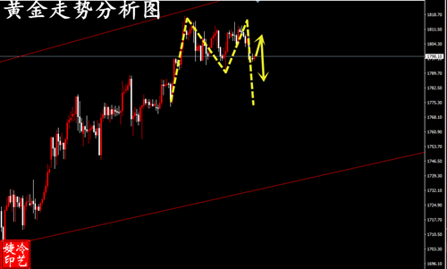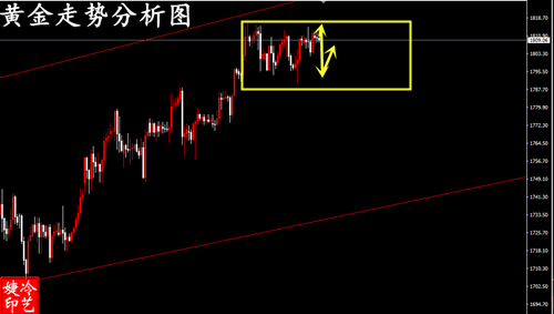 操作上实事求是,杜绝弄虚作假”大家好,我是冷艺婕老师(添加冷老师即刻给出每日操作思路精准策略) 黄金4小时级别经过5浪上涨后走势背离,并且1818成为最近9年新高点,但是黄金多头再难上涨一步,根本原因是因为此前11和12年盘整区域的月线压力!短线压力可能小震荡后可以直接突破,但是月线压力就需要月线级别的震荡来化解!黄金没有再次新高前我们将继续看跌不变! 当前黄金短线支撑是1803位置,此位置是当前盘整中轴线支撑位置,昨日回踩遇阻此区域,今日早盘回落再次遇阻,美盘的首要任务是跌破此位置,只有跌破此位置才能再次下跌至1795的支撑区域!而黄金能否展开更深度的回调,1795是中线多空分水岭位置!