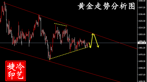 冷落金屏山十二,艺是针神貌洛神,婕妤下辇辞荣日”大家好,我是冷艺婕老师(添加冷老师即刻给出每日操作思路精准策略) @全体 黄金昨日盘中在1486-1488看空成功。晚间如期跌落1483一线。思路决定出路!一样的盘面,一样的点位,一样的时间,却不一样的心情。大涨之后的快速暴跌,搞晕了很多人,追涨杀跌又是一批牺牲者!做交易,看懂趋势是根本! 黄金日图继续阴阳循环震荡,小阳小阴实体K线较小。此前的区间1498-1477内持续震荡,短期不打破区间继续看震荡。而随着时间的推移。日图下行趋势线的防守点已经从之前的1508下移至1502附近。压力下移越来越低。整理时间越来越长,破位区间的机率也在加大今