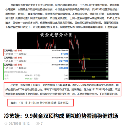 冷落金屏山十二,艺是针神貌洛神,婕妤下辇辞荣日”大家好,我是冷艺婕老师(添加冷老师即刻给出每日操作思路策略) 交易要有不达目的誓不罢休的韧劲和未雨绸缪,洞若观火的计划!黄金周线两连阴,注定了调整的开始,从周五大非农的走势也可看出,利多上涨力度太弱,并有突破前期盘整中枢,强不再强必转弱!如果按照黄金此前强势的走势,一旦出现利多消息必然是超50美金的大涨行情,但是下跌过程中的任何利好都是再次进空的绝佳点位!从侧面证明了黄金下跌趋势不变! 黄金原油日内波段走势解析: 当前黄金走势暂时受到千五关口的支撑,但是艺婕前期也说过,千五关口的支撑作用较弱,更多的是心理因素!当期黄金下跌回调走势没有改变,今日
