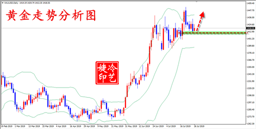 冷落金屏山十二 艺是针神貌洛神 婕妤下辇辞荣日”大家好,我是冷艺婕老师( 添加冷老师即送现价单以及中长线布局单 ) 黄金昨(7月31日)冲高回落收低,月线收官加剧了震荡幅度。美联储一如市场预期降息25个基点,整体符合市场预期,市场反映并不大,不过美联储主席鲍威尔称降息本质上属于周期当中的政策调整,并非一长串降息的开始。同时美联储还决定结束缩表,8月1日起生效,由此结束了这一非常适度、原定9月末结束的货币政策紧缩进程。美元强势走高,黄金以及非美倾向,欧元,英磅全部走低。黄金消息面之前受压在1434下方震荡,消息之后仍旧未冲破技术面的防守点,最终下挫击穿区间下轨1410.且日图收盘中阴线,月线收