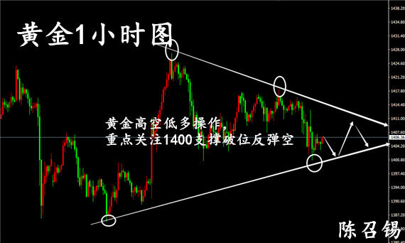 有些话,说的人动动嘴,听的人却动了心,有些单,喊的人动了心,做的人呐喊,投资不是林黛玉,不会因为忧伤而风情万种。永远没有不好的行情,只是过多的情绪和自我迷失了方向而已,即使你走的很累,但绝不可后退。下面本人陈召锡为你带来简单的一篇文章,希望可以帮助您。 黄金行情走势分析 周三美盘黄金受到消息面影响,强势大涨30多美金,但周四黄金并没有延续涨幅,反而还走出单边下跌的走势,这两个交易日的走势有点像上周二周三的走势,都是受到消息面影响走出大涨,隔日单边回落的行情。近段时间,日线布林带中轨支撑比较明显,那么今天黄金并不考虑顺势去看回落,毕竟午夜黄金大跌,给出1400低点, 逼近日线布林带中轨支撑,所