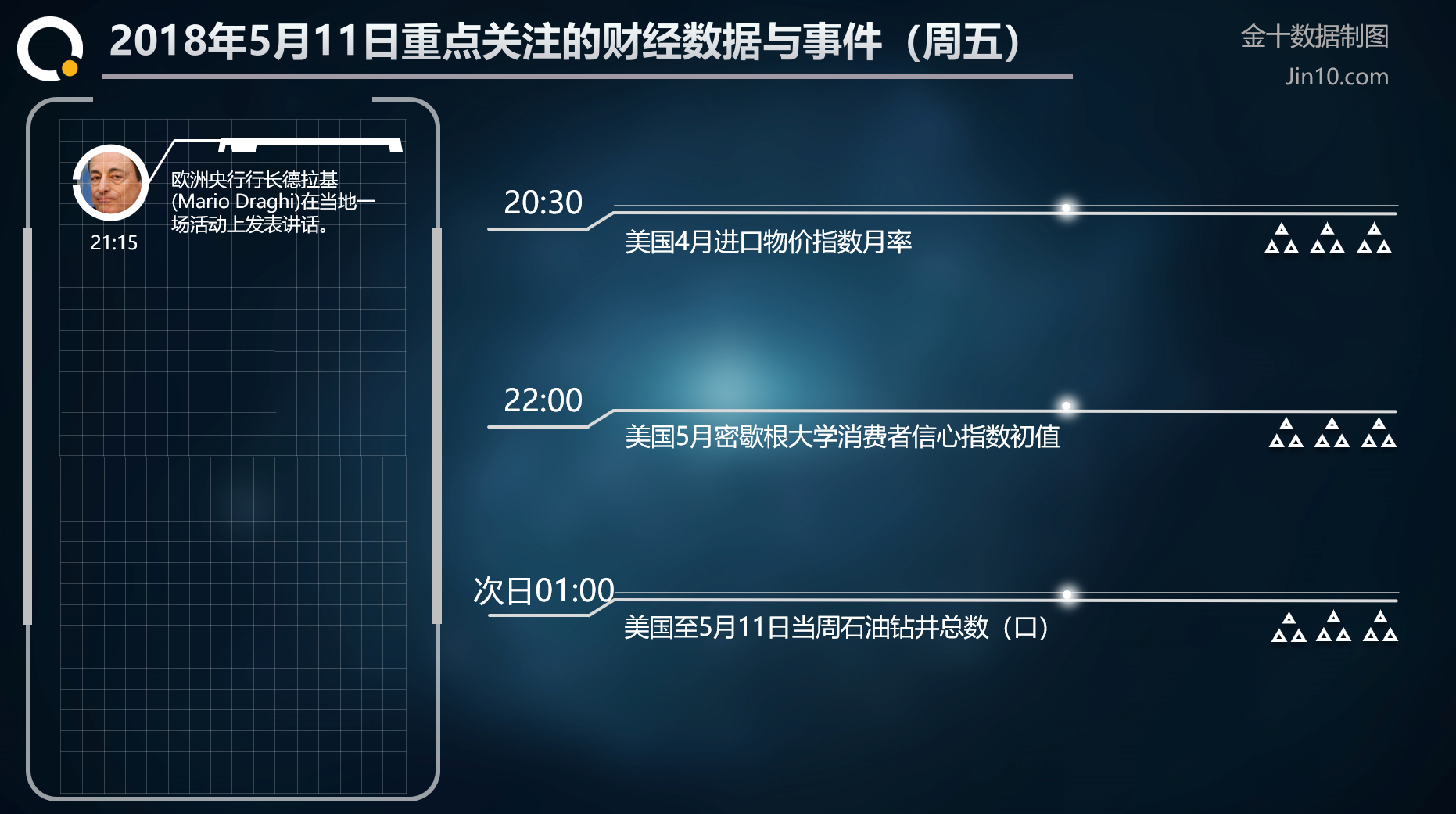 【今日重点关注的财经数据与事件】2018年5月11日 周五 ① 20:30 美国4月进口物价指数月率 ② 21:15 欧洲央行行长德拉基在当地一场活动上发表讲话 ③ 22:00 美国5月密歇根大学消费者信心指数初值 ④ 次日01:00 美国至5月11日当周石油钻井总数 【5.11早间原油行情分析】 原油近期受消息面影响以及强势技术面的影响屡创新高,昨
