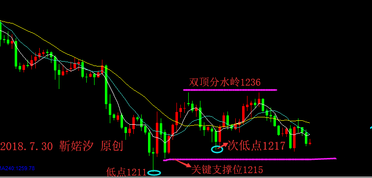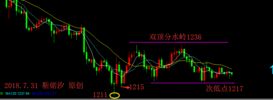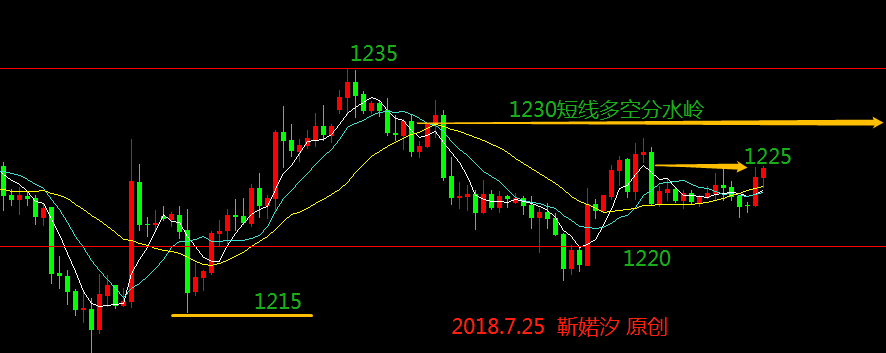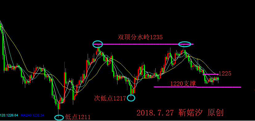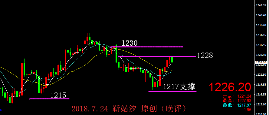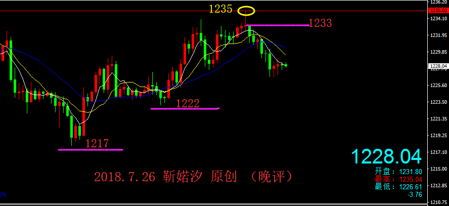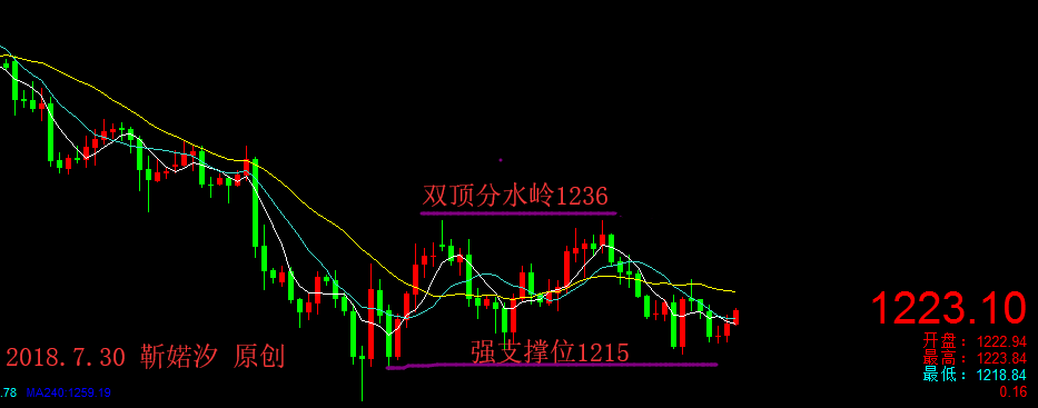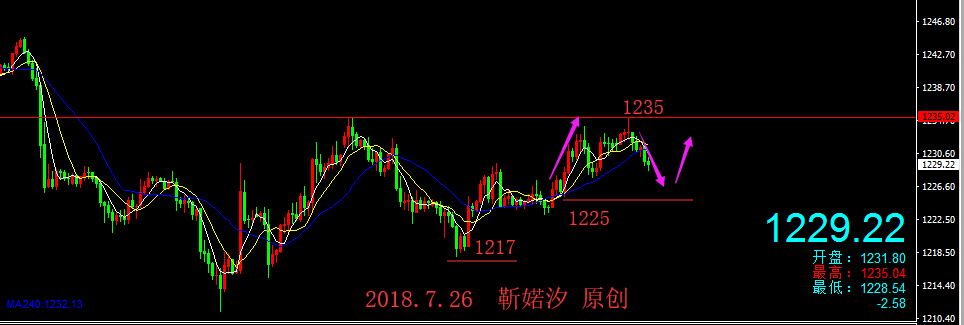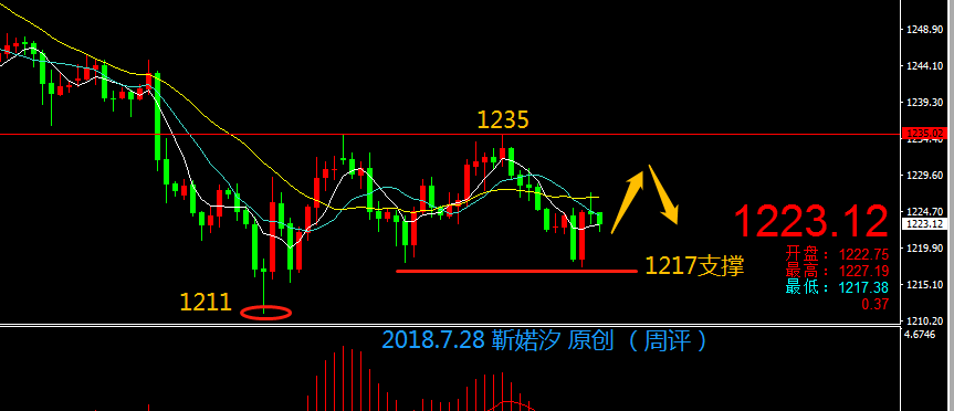 七月临近尾声,八月即将来临!一周的交易日在炎炎夏日下圆满结束了;本周整体来说,缓和了下跌的趋势,反反复复的整理,维持在1235-1217区间来回震荡,两次试探1236顶底转换位置,但都以失败告终,快速回撤延续震荡行情; 本周是黄金迎来连续第三周的下跌行情:一早盘冲高诱多,看似很强,随后欧盘震荡回落下破关键支撑,美盘快速冲高回落,日线收阴;周二周三的早盘冲高回落,午间探底企稳,欧盘碎阳反弹,美盘冲高遇阻的形态循环,续收两阳;周四行情没有延续走强趋势,在早间上冲强阻力未果回落震荡,晚间震荡下跌创周内新低,阴线收尾;昨日周五亚盘上冲未果震荡下触1217,欧盘维持震荡,美盘因美国公布二季度的GDP数