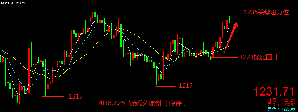 经历了漫长的等待,终于迎来了金价的小幅反弹,上冲1230关口,并一度上冲至1232一线,但现在咱们还不能认为是多头趋势了,毕竟当下的美元并没有表现弱势的迹象,且1230上方的阻力重重,若1235一线突破并企稳上方,到时再说短线多头趋势也是来的及的,所以现在咱们还是震荡对待,谨慎操作; 欧盘不断的蓄势,现在终于有了起色,金价突破了昨日的高点,来到1232一线受阻,可见上方的阻力不甘示弱,也表现出美元的强势;按照技巧,若欧盘强强突破,创近期新高,那么美盘继续上涨的可能性比较大,或许美盘时段可以择机回撤轻仓做多,依托昨日高点下方1228附近择机进场,但要控制好仓位风险; 不知道大家有没有发现近