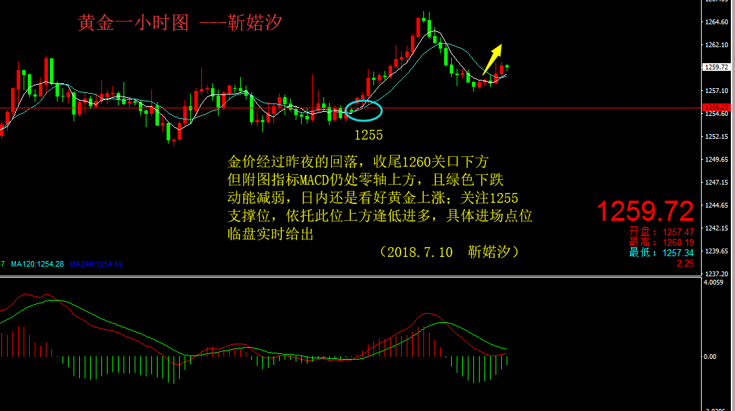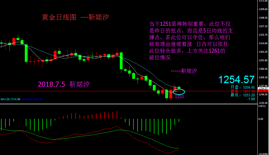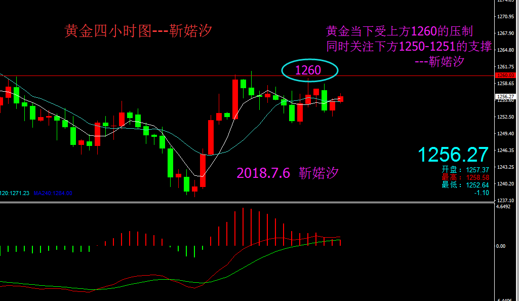果然今天由于美国独立日行情提前休市,波幅受限,行情波幅不大;早间到现在为止,金价从1251波动到1260,大约10美金左右;那么 美盘或将也是在此区间震荡吧;但是短线的多头格局不会改变的 ; 黄金周二完成探底回升,亚盘如预期一致,先惯性下踩1237周线支撑 。最终欧盘反转上升,美盘由于美指短暂回落,助推黄金大幅反弹。当然主要还是技术面的盘底时间较长。慢跌持续时间较长,但下行的空间有限。一旦止跌。反弹的幅度还是比较大的。 昨日从低到高,将近20美元的反弹幅度,直接反转了最近弱势慢跌的格局。在周五非农之前,技术面提前完成了止跌。 4小时从布林道底轨止跌回升,强行站稳了中轨,短线转为多头。 同