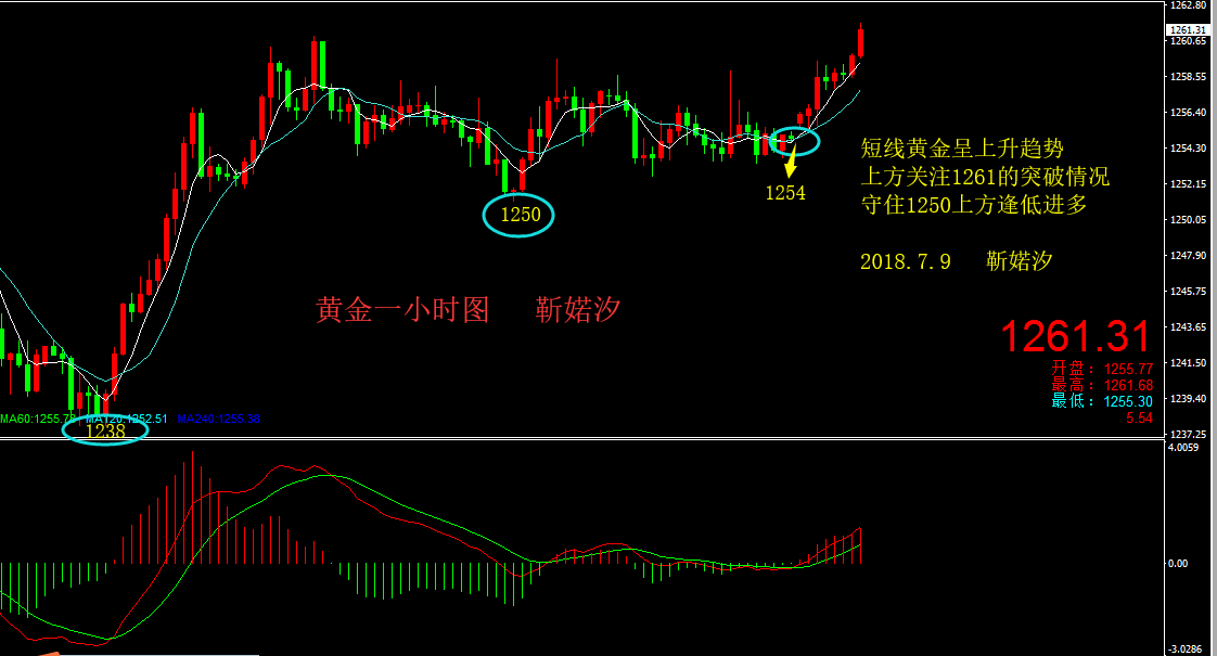 当下黄金貌似没有回撤的意思,日内一路碎阳慢涨 ,这让我们想起了上周二的行情,日内连阳,到美盘也没迎来掉头,一直冲冲冲; 所以晚间咱们继续保持看涨趋势 ;白盘给出的多单策略当下已经获利出局, 至于中长线咱们继续布局持有,若跟着博者靳婼汐的节奏,在1250附近布局的话现在已经是处于获利状态了 ;如果没跟上但想布局中长线的朋友现在还不晚哟! 现在的日线、四小时、一小时级别都处于上涨格局 ;日线5、10日均线由死叉转变金叉,附图指标MACD也处金叉形态,且红色上涨动能持续放量;再者四小时级别5、10日均线形成金叉不变,且金叉处于5、10日均线上方,附图指标MACD上穿零轴上方,出金叉形态,红色上