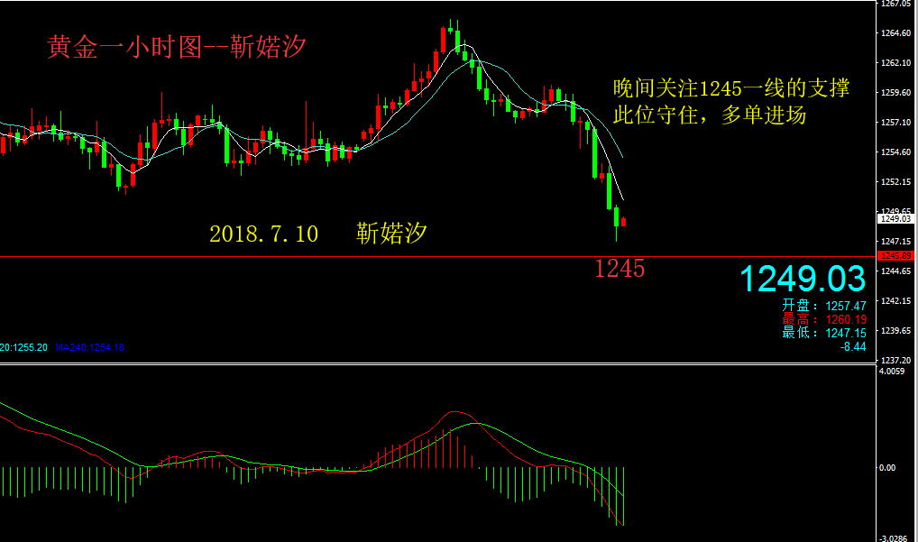 黄金剧情反转的太快了, 亚盘还在信誓旦旦的上冲1260关口,欧盘随即就跌跌不休跌破1250关口,最低下探1247一线 ;这样一来咱们是不是要改变做多策略了呢,非也, 咱们逢低进多依旧保持着 ;欧盘的破位是因特朗普的大动作:首次参加北约峰会、首次以总统身份访问英国、首次以总统的身份与俄罗斯总统普京会面,这些短线上 提振了美元,美元在昨日企稳后欧盘再度反弹,站上94关口,而黄金却成了“替罪羊”,短线内或成最大的“倒霉蛋”; 今日黄金在连续几日上涨后再一次走弱,重新回归1250关口下方; 1250关口丢失,那么下方或许还有更大的下跌空间,但这不代表黄金多头的反转 ;换个思路想想,现在金价的下跌,或