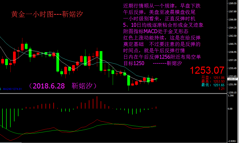 今日白盘行情有又延续了上周咱们一直说的一个走势规律:早盘稍下跌,午后反弹,随后下跌,欧盘持续震荡 ;黄金在午后小幅反弹1254一线后出现下跌,价格未能打破1255一线周五反抽的高点位置上,而下跌之后欧盘维持震荡,这样一来, 美盘时间段可能依然保持震荡式下跌为主 ;若美盘前能够再有所小幅反弹,出现一个诱多的动作。这对布局空单无疑是雪中送炭呢! 当下行情整体处于一个弱势格局,反弹之后顺势接空是比较理想的一种走势 ,也是较为稳健的操作; 亚盘的震荡下行,欧盘没有破底,持续震荡,走出下跌之后弱势反弹;此刻 一小时级别,在下跌之后,没有出现连阴的格局,尾盘收线则很关键 ;同时短期均线指标MA5明显下穿