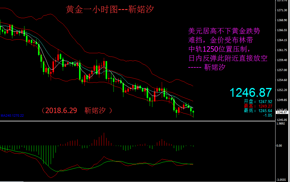 本周最后一个交易日又将结束了,今日也是6月的最后一个交易日, 每当到这个时候咱们不得不做的就是对本周行情走势进行梳理归类总结,这样才能更好的跟随和把握行情的运行节奏,更好的预判后市行情 : 本周行情一直处于跌势中,已经是连续两周下跌,目前金价从1273位置跌到了1245一线,跌幅28美金;日线本周无一根阳线收尾,连收四阴 ;本周一直遵循的一个规律就是亚盘下跌,午后反弹后再下跌,美盘至午夜横盘不下;因此日线一直是以阴收尾;本周每个交易日都是冲高回落,但是冲高幅度不大,反倒是回落幅度较大,使得金价高低点都在不断的下移; 近期黄金一直深受美元的强势格局,跌跌不休 ;值得一说的是昨日周四行情,尽