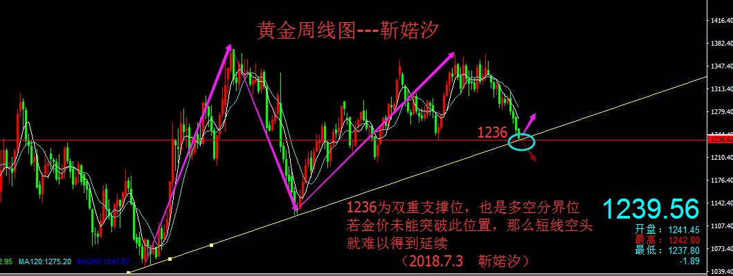 六月匆匆即过,7月姗姗来迟;新的一月新的交易日,新的开始,新的利润,让我们一起努力赚赚赚,乐乐乐! 上周黄金走势可谓是“屋漏偏逢连夜雨” ,一周之内连续4日录得下跌,周线连续第三周收阴,最终勉强收于1250美元关口上方。 本周市场将引来新的交易月,市场重点关注美联储会议纪要和周五的非农会议纪要 。 目前黄金周线已经连续三周收阴,且是实体较大的阴线, 5周,10周,20周均线全面压制金价,这么一看,貌似没有止跌意向 ,所以本周 1238周线支撑位需要特别关注 ; 若本周收阳,则下周有可能探底回升形成阶段性底部,黄金或将初步形成筑底,多头也或将开启反击之战 ;当然,咱们是希望金价能够重新站上主导