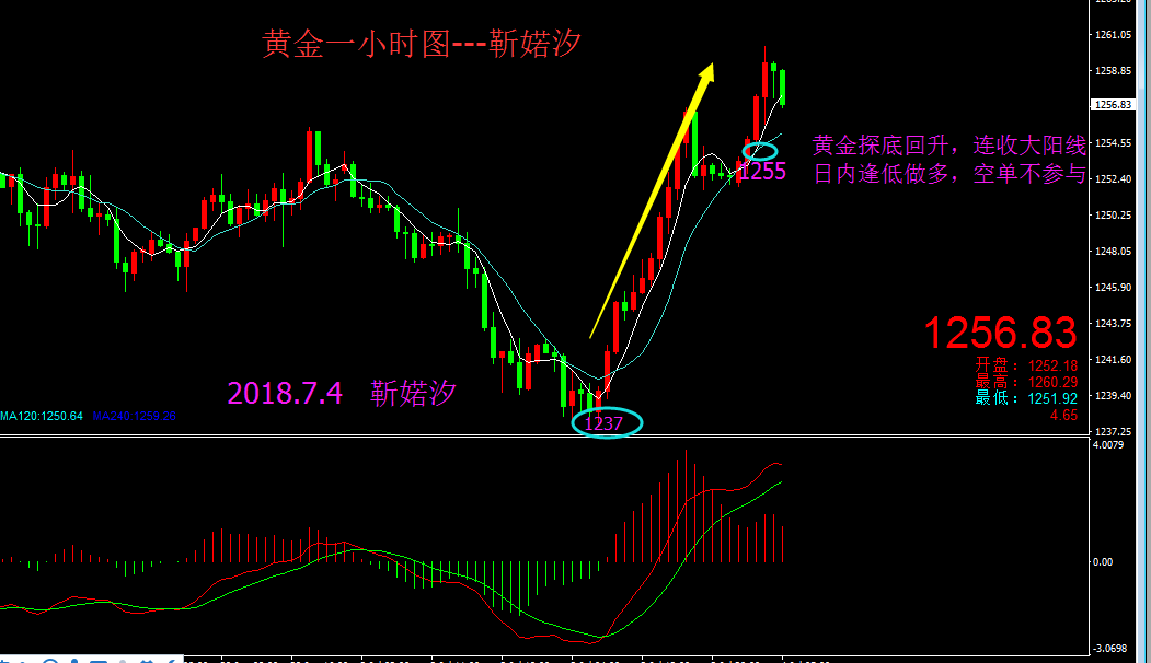 昨日咱们还说现在的 美元成了黄金的“头号敌人”, 强势的美元一直黄金是多头的一个“大麻烦”;不料昨日在节假日来临前市场交投清淡, 美元在连涨三个月后开始整理涨幅,一再走软,而美元的走软给金价提供了很大的支撑,黄金开启大反攻,日内金价呈现深V反弹之势 ,从1237涨至1257一线,共20美金的波幅,这是近期以来的最大波幅,甚至比上月非农波动还要大,这下 黄金多头终于迎来扬眉吐气的一天,多头喜笑颜开 ! 今天 纽交所因独立日假期休市,市场波动性可能会继续减弱 ;昨日金价的探底回升,下跌止步于前期低点1237一线,形成强有力反抽,且日内小时线连阳,美盘抗跌凌晨二次延续,上至1260一线。再者日线锤