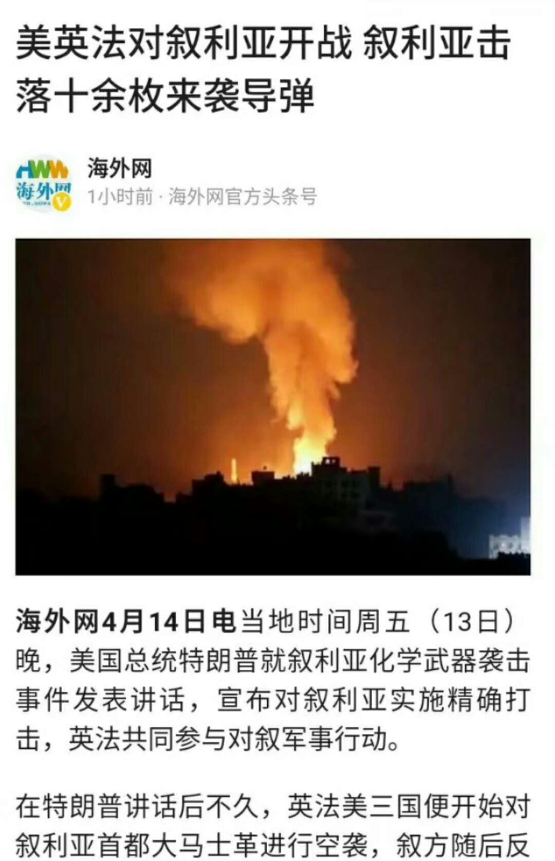 近期的美叙事件又有新的进展了:北京时间周六(4月14日)9时左右,当地时间周五晚上9时,美国总统特朗普发表电视讲话称,已经下令对叙利亚进行打击,对涉化武地点实施精确打击,联合行动获得法国、英国支持。特朗普指出,准备维持当前回应直至叙利亚停止使用化学武器,叙利亚化武袭击事件是俄罗斯没能阻止叙利亚使用化学武器