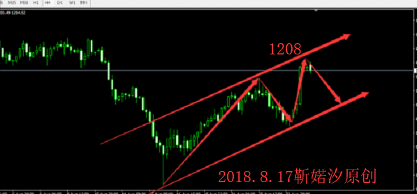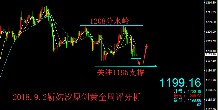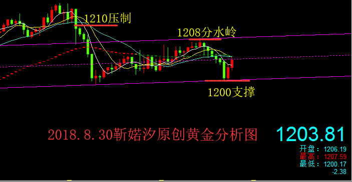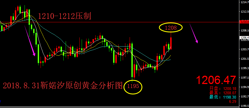 今天这日子还挺特殊,既是月底月线收官之夜,又是本周的最后一个交易日,下周就进入金九银十的行情;还是老样子,先对本周前四个交易日的行情进行一个进行归纳总结梳理,这样才能更好的跟随和把握行情的运行节奏,更好的预判后市行情: 本周周初黄金看似很强,反反复复来来回回震荡,上没破高,反倒下穿1200大关口,弱势趋势再度袭来,最终还是敌不过美元的强势;周一行情延续上周五的强势行情,守住1200关口,上触1212一线,再收阳线;周二震荡冲高回落跌破1200,随后企稳1200关口收阴;周三缩小震荡幅度,1200-11207区间来回震荡,收小阳线; 昨日周四白盘小幅震荡,美盘两大利好美元来袭:首先新兴市场再现