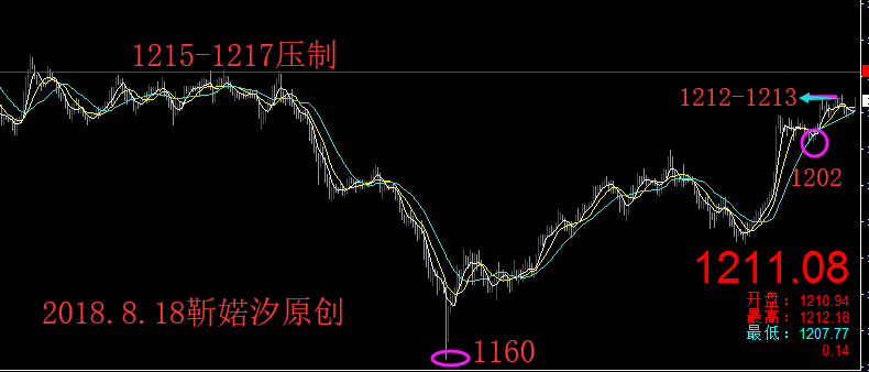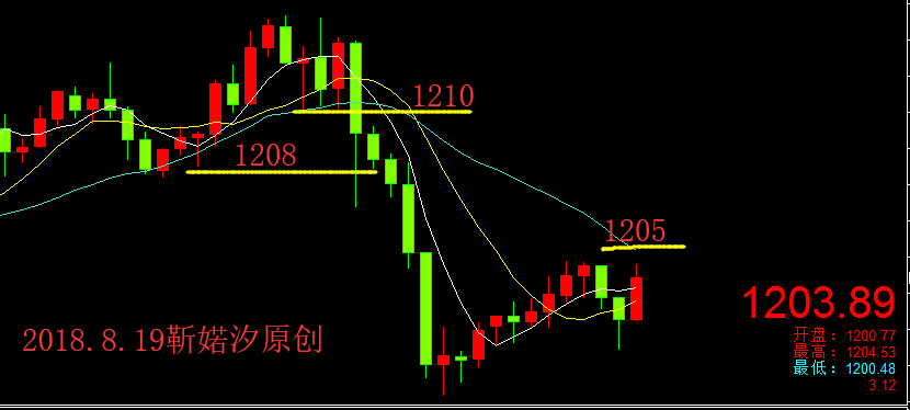 上日白盘黄金涨势不减,直攻1214一线,相信很多朋友的多单赚了一波;而黄金午夜崩盘,大回调,相信也有在1208附近及很多点位被套吧!那该怎么办呢?请耐心往下看: 1、在1208多单被套的朋友,午夜的回调确实够深,目前被套了6个点!目前短线趋势整体还是偏多,但也不能掉以轻心!先关注1205-1206的压制,1208是个关键位置,破位即可看1210-1213,盈利还是有可能的,关键就是1208的压制情况! 2、在1205附近套单的朋友,不用太担心,目前黄金还没有跌破1200,1200支撑也是韧性十足的,还是有上攻机会;当下上行第一道压力就是在1205,其次是1200的支撑,不破上拉的时候在关注1