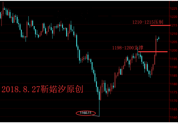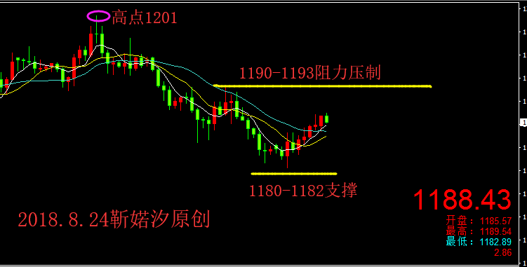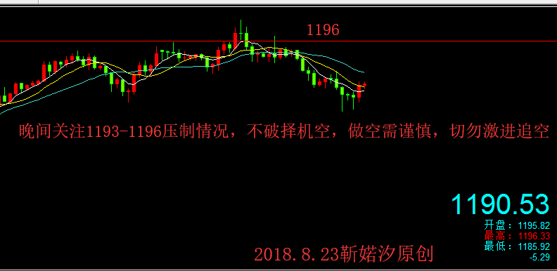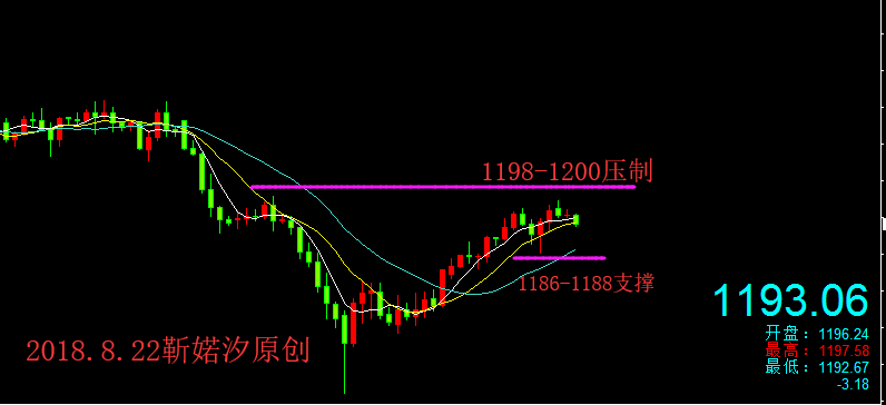 上日美元连续第4日下跌,只因特朗普批评美联储引发的抛售热潮,黄金则不断的攀升,这是黄金连续第三日攀升;在早间上冲1196一线受阻后欧美盘震荡下行,尾盘因特朗普前私人律师科恩认罪的消息刺激黄金短线探底回升,触及一周高位,最终阳线收尾; 当下市场对黄金来说,利大于弊,毕竟现在有着特朗普给黄金“撑腰”--批判美联储;而现在黄金的反弹正受到特朗普对美联储政策及货币市场评论的助推,也就是说只要特朗普继续给黄金“撑腰”,那么美元或将不会那么强势,黄金就有机会喘气反弹,这显然特朗普的“嘴炮”是有利于黄金进一步上行; 欧盘金价的震荡下行,回撤力度不大,随后探底回升继续收阳,那么今日反弹的延续性仍然存在;