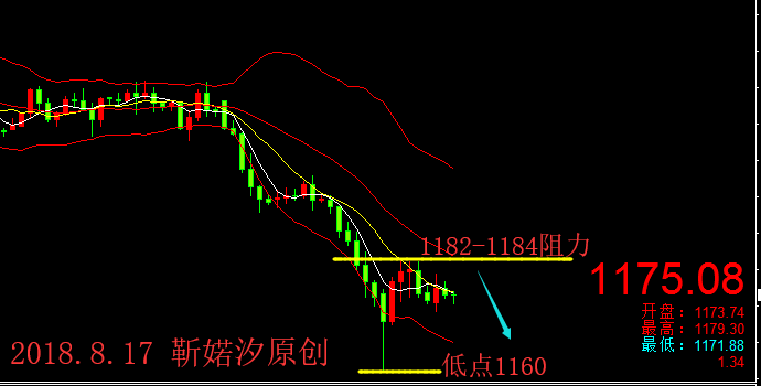 上日黄金行情跌幅再度超过20美金,日线继续录得大阴线,今天早盘上冲1176后再度急跌回落直击1160一线,上日行情还算是缓慢回落,不料今早突然来了个猛地回落,再创新低,不过最近每天都有新低,现在来看没什么惊讶的了; 当前行情反弹到1170上方,现在可以初步确定1160见底概率较大,而现在行情极弱,后市反复震荡概率极大;那么急跌后反弹的行情我们不追空,还是按照惯例等待反抽,高位介入空单最佳,具体在什么位置适合介入,博者靳婼汐临盘给出具体策略;上方先关注1178-1180阻力突破情况,布局空单但不追空! 当下弱势的行情还在逆势做多的朋友市场上应该比比皆是吧!对于你们现在手里套的多单,婼汐我真