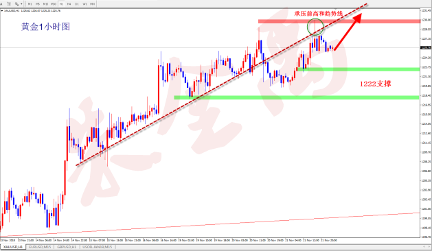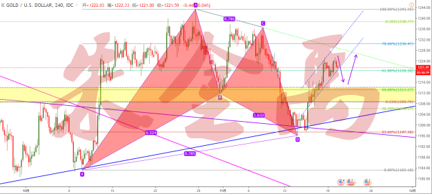 文/朱金禹撰(vx:zjy6679;助理qq:1744354320) 文章概要:1.黄金基本面解析;2.金禹个人解析;3.黄金行情解析及后市操作建议;4.黄金解套策略; 黄金基本面解析: 英国脱欧再爆惊闻,虽然首相梅周三拿下内阁大部分人员通过脱欧协议草案,但由于协议中爱尔兰边境担保内容仍然威胁英国主权,草案公布后内阁分歧扩大,周四爆发要员辞职浪潮,激发市场避险,现货黄金从中受益;与此同时,美联储昨日至少四名官员发表讲话,其中除了金融监管副主席夸尔斯在其第二日的经济证词中继续对美国经济发展预期乐观外,美联储主席鲍威尔讲话“鹰”味不足;亚特兰大联储主席博斯蒂克以及明尼阿波利斯联储主席卡什卡里的基