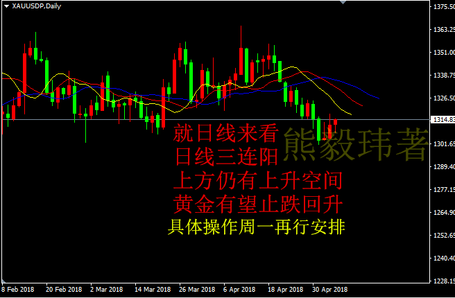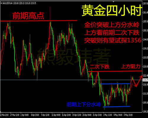 没有自信,任何事都小心谨慎,越是亏损越是做错。实力才是硬道理,要懂得让钱为你工作,而不是你为钱工作,我是熊毅玮,一位敢说真话的分析师,策略家,财经时评人! 行情回顾---黄金强势上涨,创五月以来最高 5月十日黄金强势上涨,美盘强势上涨触及1322一线,黄金价格突破前期高点1318这一阻力位,到达5月以来最高点位。周