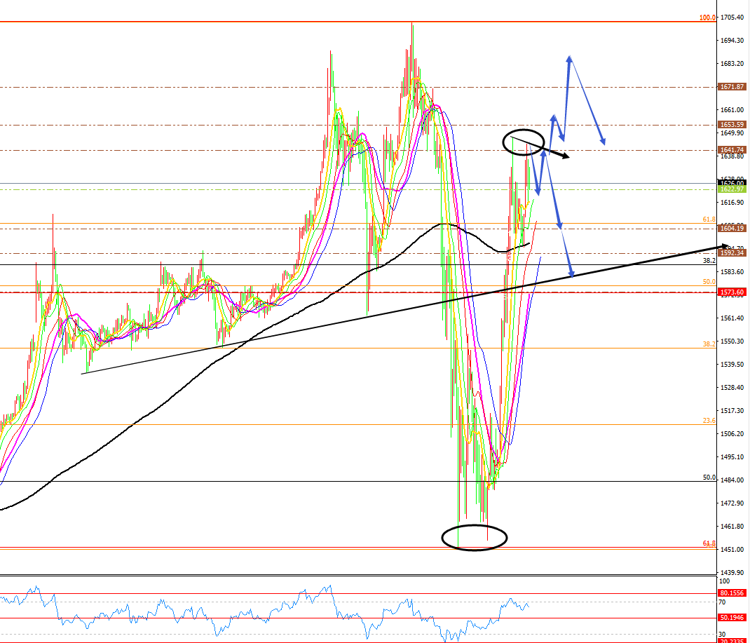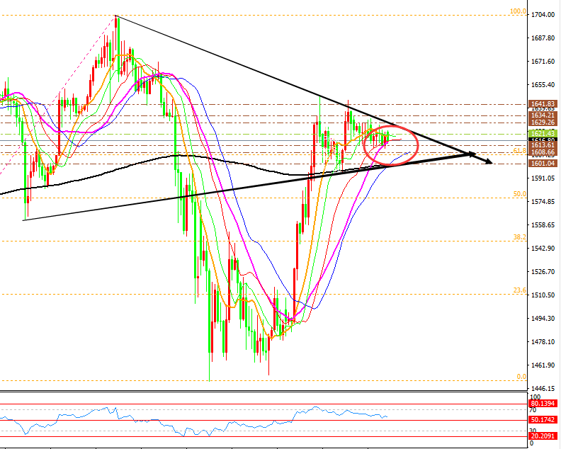 黄金分析策略: 方向:多 目标:1658/1678 阻力:1640/1658/1678 支撑:1615/1600/1565 拐点:1658 多空分水岭:1600 今日操作:低多为主,高空辅助 止盈中间有减仓,止损中间有斩仓:意思是说 止盈虽看10美金 但行情仅到了第一支撑无法逾越,那么即便是15美金的利润也和你无缘。则会导致盈利变亏损。减仓需要第一个小波段提前处理一次利润收割。而不是任意妄行,狂妄爆粗。说什么不到止盈不出局。减仓是提前收割利润,而不是做逃兵。减仓后 剩余的半仓是你拿着已经收割的利润去博弈止盈。所谓止损中间有斩仓,死等止损就是在错误的时候任人宰割。一个波段