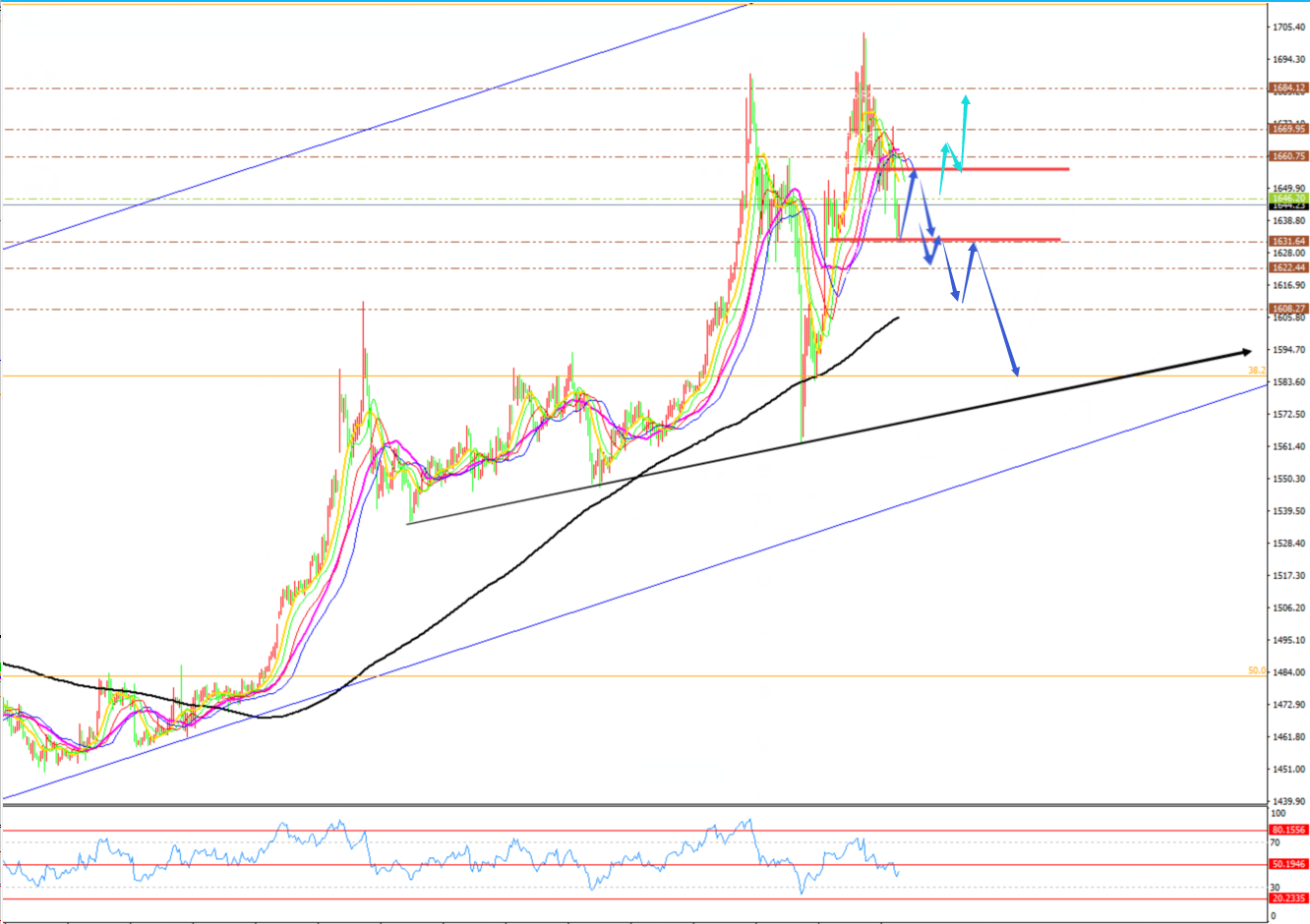 黄金分析策略: 方向:短空 目标:1551/1541 阻力:1578/1595/1610 支撑:1551/1541/1533 拐点:1541 多空分水岭:1578 今日操作:低多布局辅助,短空为主 有个人丢失了一把斧子,怀疑是他邻居家孩子偷的。于是看那个孩子走路,像偷斧子的;表情,像偷斧子的;说话,像偷斧子的;动作、态度无论干什么,没有不像偷斧子的。不久,他在山谷里挖地,找到了那把斧子。过了几天又见到邻居家孩子时,发现那孩子的动作态度便没有一点像偷斧子的人了。其实,很多人在研判行情时就像那个丢斧子的人,比如当自己做多时,看技术指标像是买入信号,看基本面像正在转暖,形态