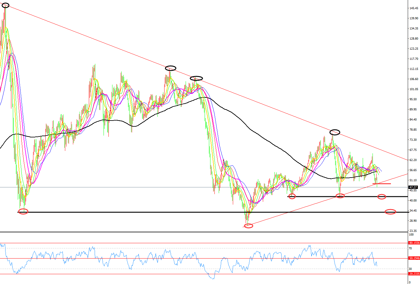 原油分析策略: 方向:短空 目标:57.7/56.3 阻力:59.5/50.0/50.5 支撑:47.7/47.0/46.3 拐点:47.7 多空分水岭:51.5 今日操作:中线低多为主,短线高空辅助 纪律是一百多年以来交易市场上各种成功和失败经验的高度总结,是用无数金钱和心血所换来的成果。翻开交易历史,你就会发现市场有时是多么幼稚可笑,多少人曾经犯过多少幼稚可笑的错误,然而现在和将来这些幼稚可笑的事件必然会重演,因为虽然市场在前进,时间在前进,但人性不会变,人类对金钱的贪婪和恐惧不会变,人类想征服自然和市场的欲望不会变,绝大部分的人很容易忘记历史,也不愿意去看