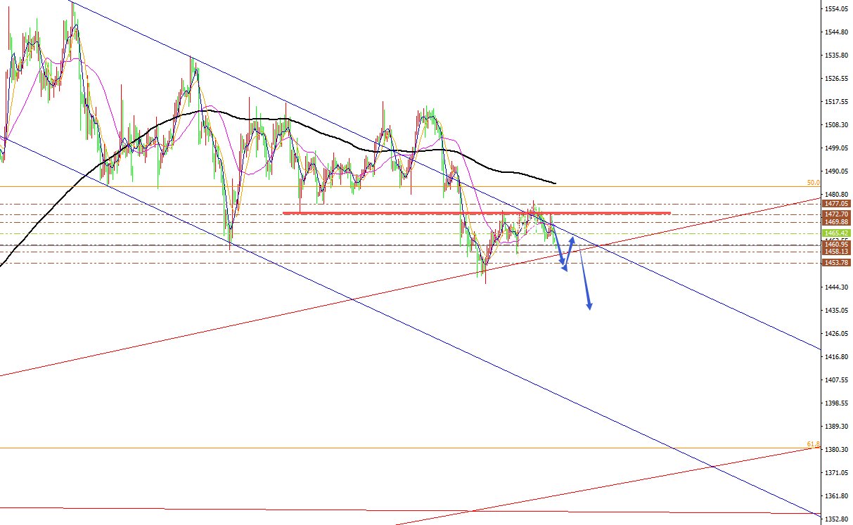 黄金分析策略: 方向:空 目标:1453/1448 阻力:1465/1468/1474 支撑:1458/1453/1448 拐点:1448 多空分水岭:1468 今日操作:高空为主,低多辅助 如果没有规则,金融大鳄进来之后,一定是以大欺小、以强欺弱。如果你是池塘里的一只鸭子,由于暴雨的缘故水面上升,你开始在水的世界之中上福但此时你却以为上浮的是你自己,而不是池塘。如果市场总是有效的,我只会成为一个在大街上手拎马口铁罐的流浪汉。生机总在绝望时出现,当你忍无可忍时再忍五分钟;当你想放弃时,再试一次吧!市场就像上帝一样,帮助那些自己帮助自己的人,但与上帝不一样的地方是,他不