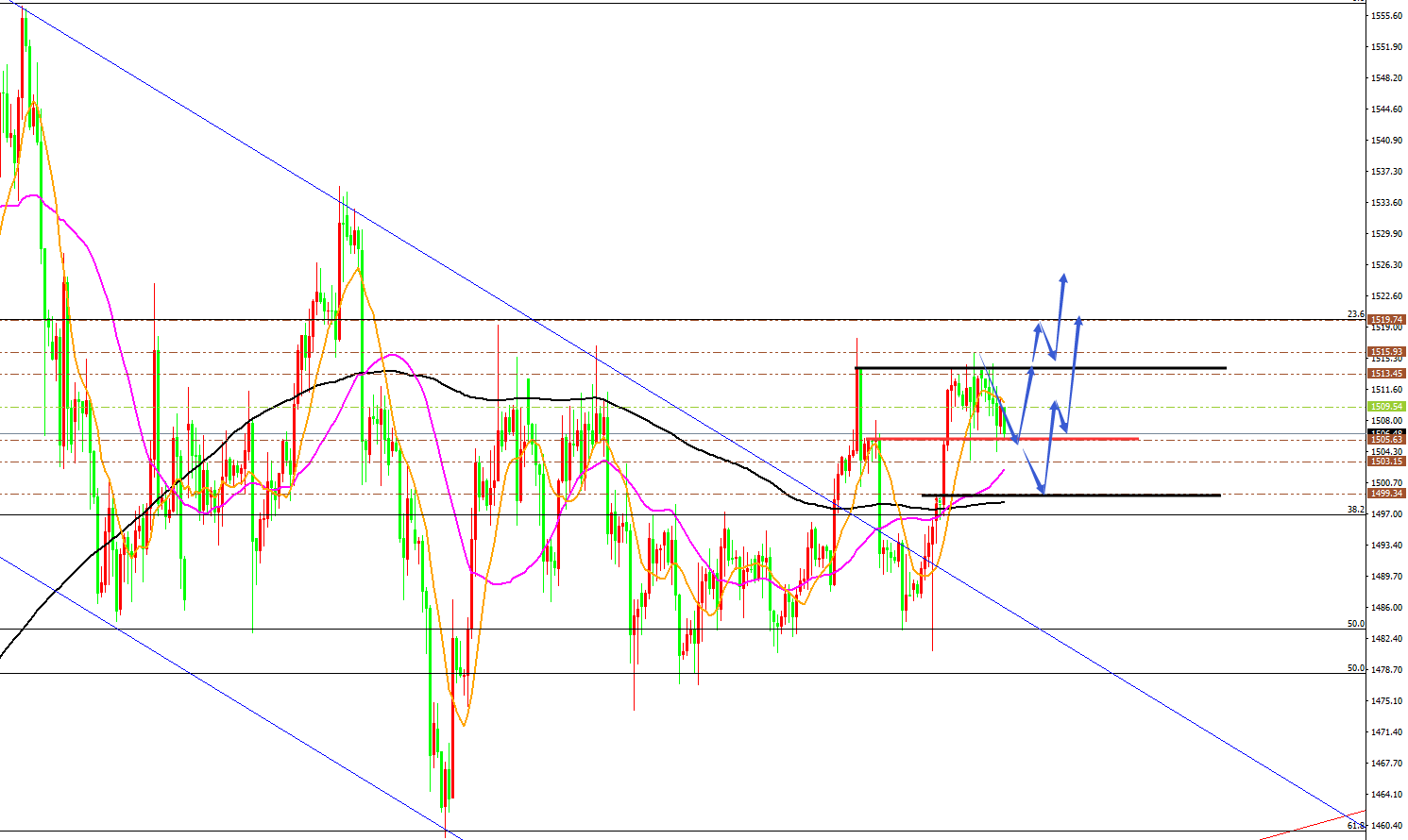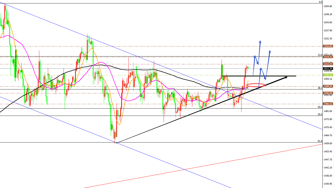 黄金分析策略: 方向:多 目标:1515/1523 阻力:1515/1523/1528 支撑:1504/1498/1493 拐点:1515 多空分水岭:1500 今日操作:低多布局为主,高空辅助 如果没有规则,金融大鳄进来之后,一定是以大欺小、以强欺弱。如果你是池塘里的一只鸭子,由于暴雨的缘故水面上升,你开始在水的世界之中上福但此时你却以为上浮的是你自己,而不是池塘。如果市场总是有效的,我只会成为一个在大街上手拎马口铁罐的流浪汉。生机总在绝望时出现,当你忍无可忍时再忍五分钟;当你想放弃时,再试一次吧!市场就像上帝一样,帮助那些自己帮助自己的人,但与上帝不一样的地方是