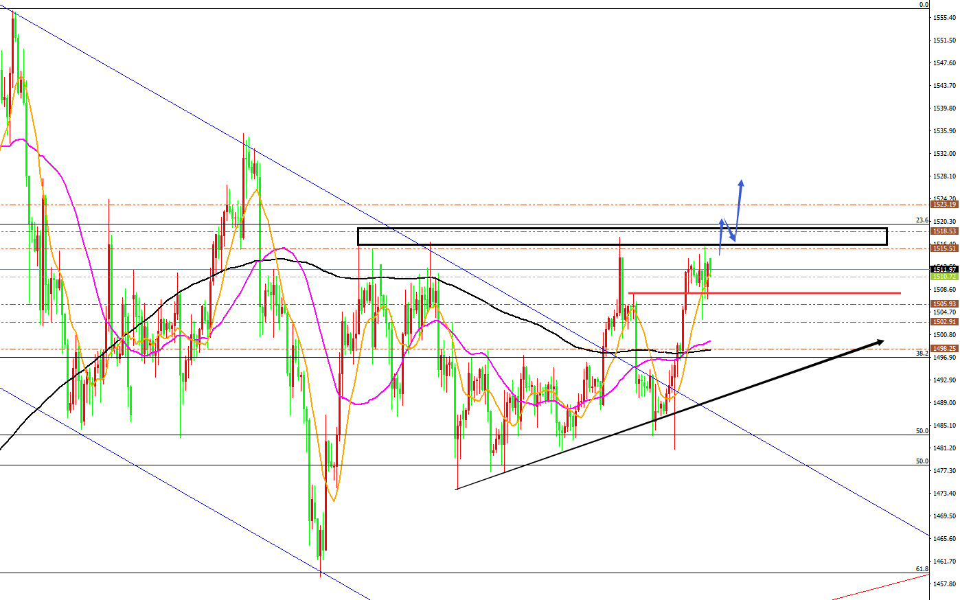 黄金分析策略: 方向:多 目标:1523/1528 阻力:1518/1523/1536 支撑:1510/1506/1500 拐点:1518 多空分水岭:1506 今日操作:低多布局为主,高空辅助 如果没有规则,金融大鳄进来之后,一定是以大欺小、以强欺弱。如果你是池塘里的一只鸭子,由于暴雨的缘故水面上升,你开始在水的世界之中上福但此时你却以为上浮的是你自己,而不是池塘。如果市场总是有效的,我只会成为一个在大街上手拎马口铁罐的流浪汉。生机总在绝望时出现,当你忍无可忍时再忍五分钟;当你想放弃时,再试一次吧!市场就像上帝一样,帮助那些自己帮助自己的人,但与上帝不一样的地方是