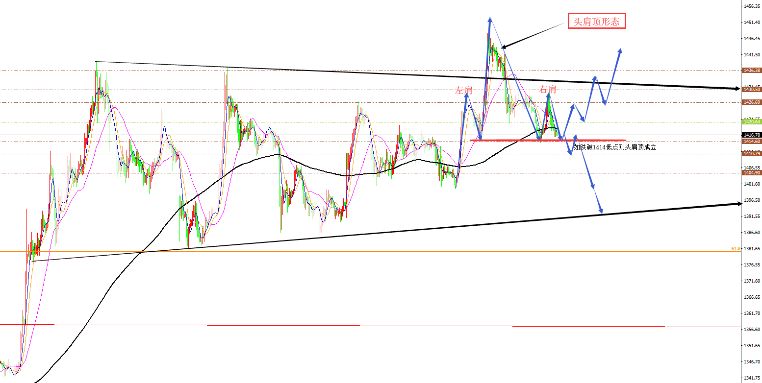 黄金分析策略: 方向:震荡 目标:1426、1430/1414、1400 阻力:1426-1430-1438 支撑: 1414-1403-1396 小区间:1414-1426 大区间:1396-1438 今日操作:短线高空辅助,中线低多为主。 如果没有规则,金融大鳄进来之后,一定是以大欺小、以强欺弱。如果你是池塘里的一只鸭子,由于暴雨的缘故水面上升,你开始在水的世界之中上福但此时你却以为上浮的是你自己,而不是池塘。如果市场总是有效的,我只会成为一个在大街上手拎马口铁罐的流浪汉。生机总在绝望时出现,当你忍无可忍时再忍五分钟;当你想放弃时,再试一次吧!市场就像上帝一样,帮助那些自己帮