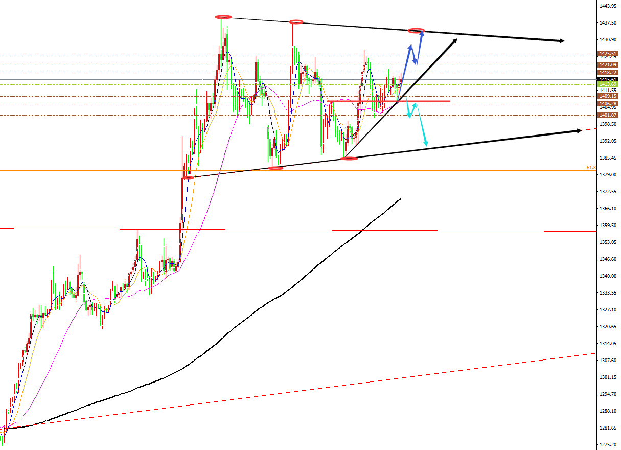 石扬:2019年7月05日非农分析及策略 非农分析策略: 非农就业人数前值为7.5万,本期的预期值16万,远高于前值市场预期是利空金银。笔者预期此次非农数据公布将利多金银。笔者认为公布的非农实际值将小于16万的概率较大,公布实际值可能在14万左右,小于预期值的16万,不及预期是值利多金银。不过实际值又好于前值的7.5万,说明美国就业市场较上一个月有所好转,就业人数有所增加,所以注意利空。 非农节奏:关注先跌后涨,出现单边走势的概率较小。 1、本期非农公布实际值在14万左右,大于前值7.5万,但小于预期值的16万。则利多金银,节奏关注先跌后涨! #:日内守住1410关口支撑在亚盘低点