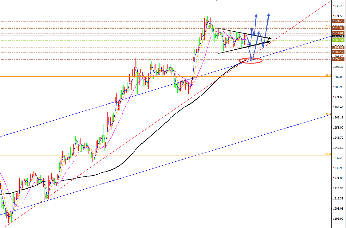 黄金 、原油分析策略: 阻力:1318-1323-1328。 支撑:1306-1302-1297。 小区间:1308—1318。 大区间:1297—1328。 今日操作:低多、中多布局,短线高空辅助。 最新日线图MA10、MA30日均线粘合后,10日均线拐头向上击穿30日均线形成金叉,30日均线击穿200日均线1250上移至1300, 日线图MA10日均线受阻1314后出现向下拐头下移至1310 。 黄金纽约收盘价站上200日均线的中期多空分水岭1250后,将继续延续多头运行,打开第一轮上涨。目前 金价 刺破1300关口将打开第二轮上涨空间,已经第二轮的上涨。金价中期我们坚守看涨不变