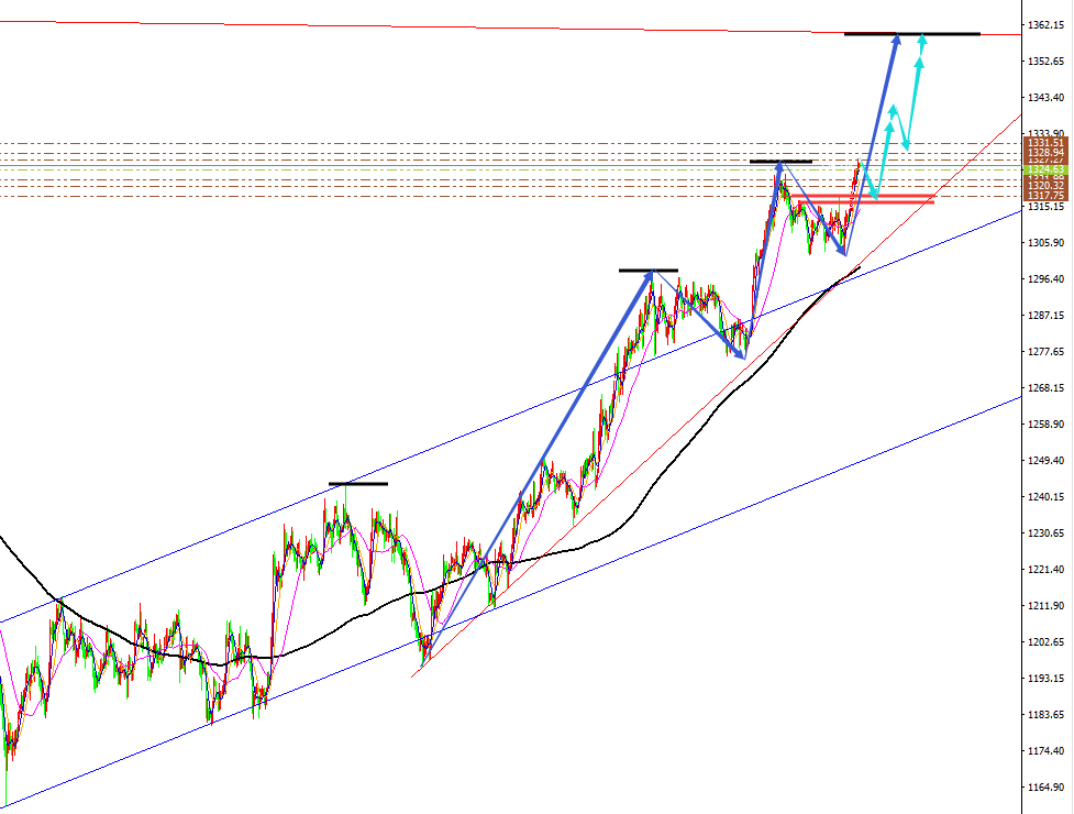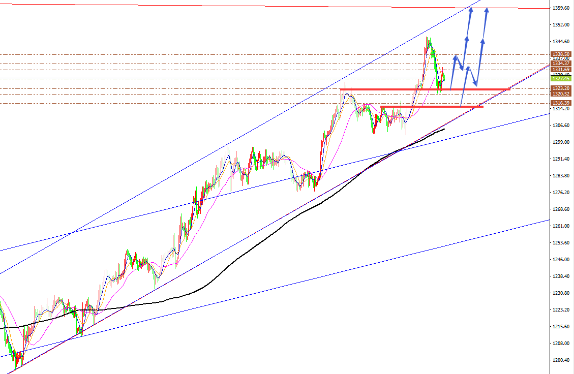 黄金 、原油分析策略: 阻力:1333-1338-1345。 支撑:1322-1316-1313。 小区间:1325—1335。 大区间:1316—1346。 今日操作:低多、中多布局,短线高空辅助。 最新日线图MA10、MA30日均线粘合后,10日均线拐头向上击穿30日均线形成金叉,30日均线击穿200日均线1250上移至1309, 目前最新MA10日均线上移1323,纽约收盘价继续保持10日均线支撑上方运行,MA30日均线支撑1301与MA30日均线开口向上。 金价 中期我们坚守看涨不变,中期看涨目标关注1356、1380,中短线金价继续保持低多中多运行。黄金1160/1163、