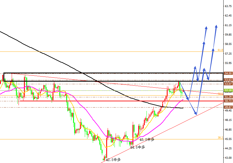 黄金 、原油分析策略: 阻力:1283-1288-1293。 支撑:1275-1270-1266。 小区间:1275—1285。 大区间:1266—1296。 今日操作:低多、中多布局,短线高空辅助。 最新日线图MA10、MA30日均线粘合后目前10日均线拐头向上击穿30日均线形成金叉,10日均线向上拐头上移1265点位,30日均线同步上移位于1244点位,目前10日均线向上击穿200日均线1250,黄金站上中期多空分水岭1250后打开新的一轮上涨空间, 金价 中期我们坚守看涨不变,中短线金价继续保持低多中多运行。黄金1160/1163、1198、1207、1221、1233中线多
