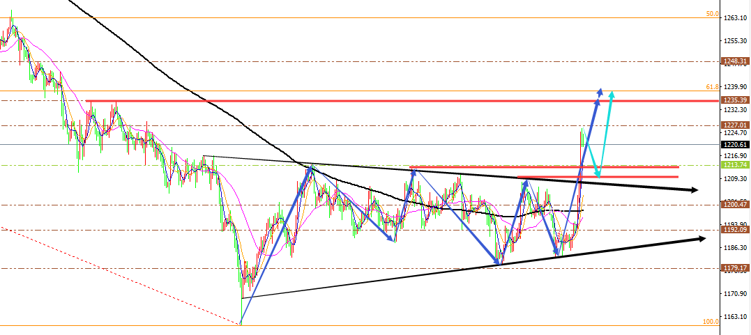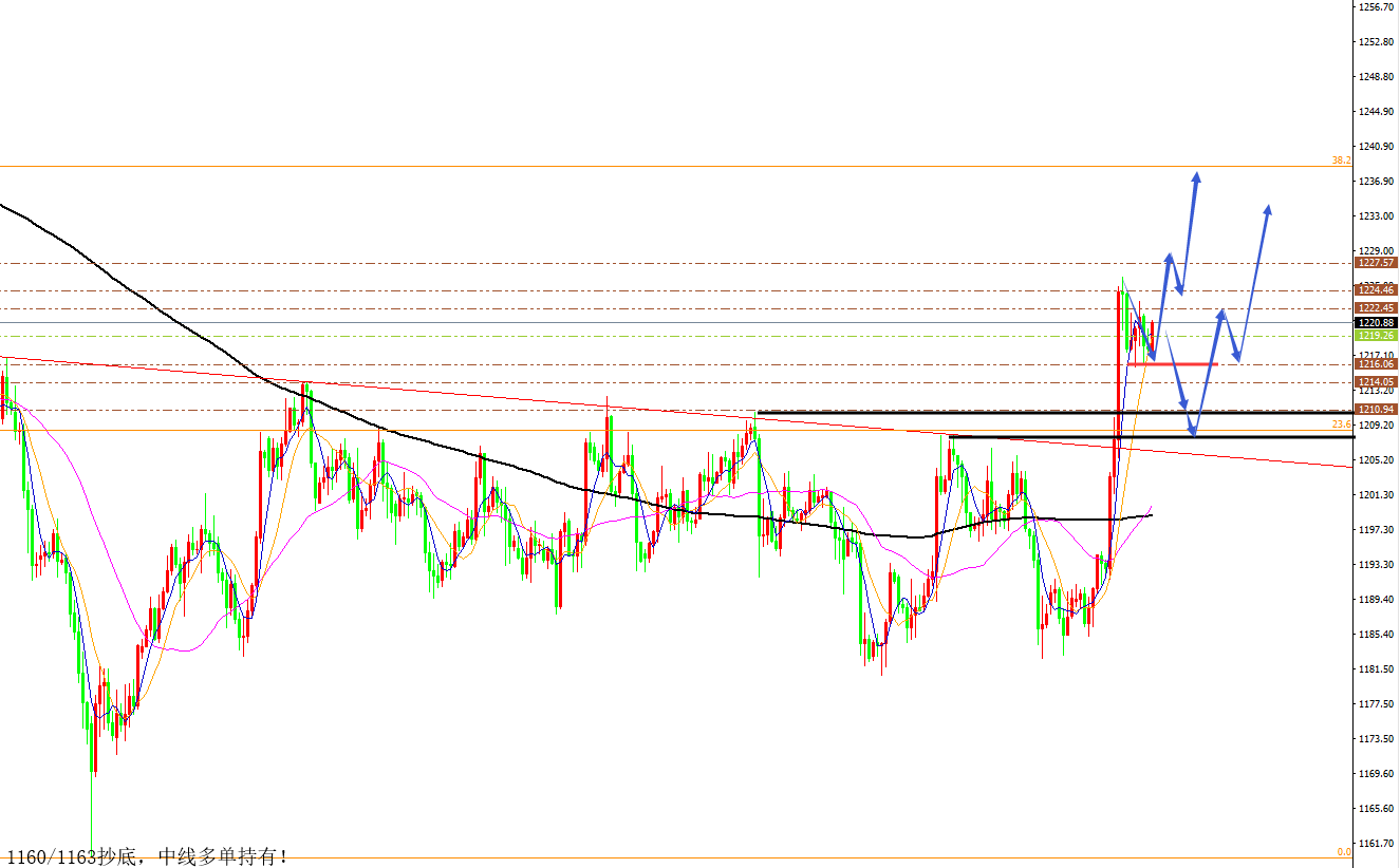 黄金 、原油分析策略: 阻力:1228-1235-1240。 支撑:1213-1207-1201。 小区间:1213—1233。 大区间:1210 —1240。 今日操作:低多、中多布局,短线高空辅助。 最新日线图10日、30日均线价格位于1200、1198,10日均线拐头向上击穿30日均形成金叉开口向上,各周期均线指标日线图均形成向上拐头, 金价 突破1214、1213前高压制,形成趋势性突破行情。黄金1160/1163中线多单持有不变, 白银 14.3-14.4中多单持有不变! 纸白银 3.2-3.1元/克成本, 纸黄金 262元/克做中线持有不变。 黄 金 日线大阳暴