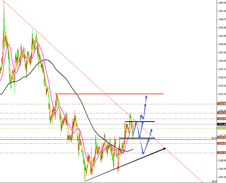 阻力:1318-1323-1328。 支撑:1312-1308-1303。 小区间:13021322。 大区间:12931326。 今日操作:低多为主,高空辅助。 自金价下探1236筑底迎来上升驱动浪,我们中线多单已在1240布局并持有,金价一级上涨1325结束,突破1300后迎来二级上涨,2浪回调1308后3浪级别上涨最高触及1344.5,日线图金价走大五浪上升目前承压13