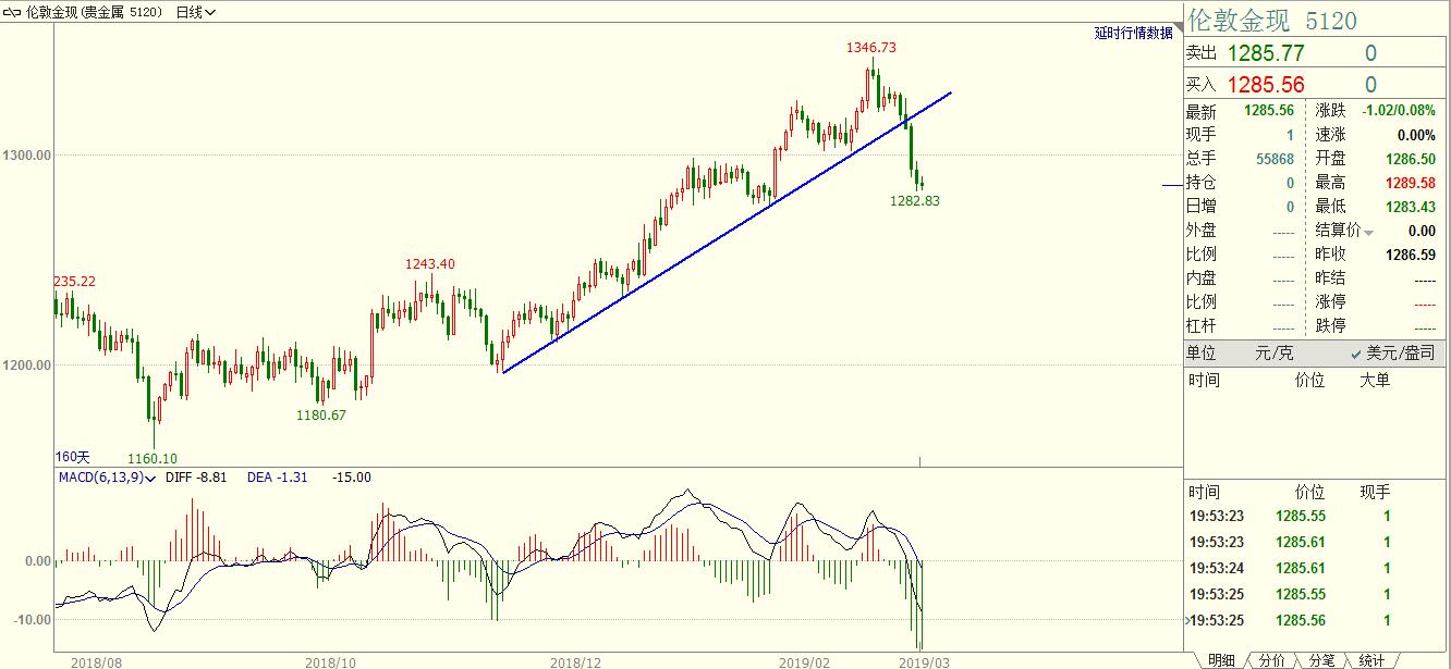 交易人最大的敌人是自己-贪婪、急燥、失控的情绪、没有防备心、过度自我等等,人的本性是很可怕的,那么就需要常常静下心来好好反思,寻找自身的优缺点,若贪婪那么就见好就收,若急躁不妨放下手里的事,等自己慢慢平复再去接着做,要学会调整心态,急是急不来的沉着冷静方是处事之道 。 黄金 :空头趋势。这一波空头笔者生生错过去了,在2月28号的早盘点评中还计划过反弹1325空,一犹豫就没有下单,现在看实在是可惜了,40美金的幅度失之交臂,可见系统信号和交易计划的重要性。 这一波下跌来的太突然,系统只发出过一次做空信号,之后就没有产生新的信号,只能观望。技术面上,黄