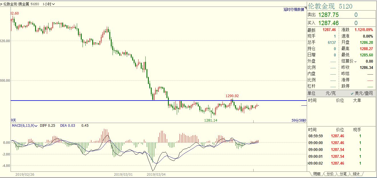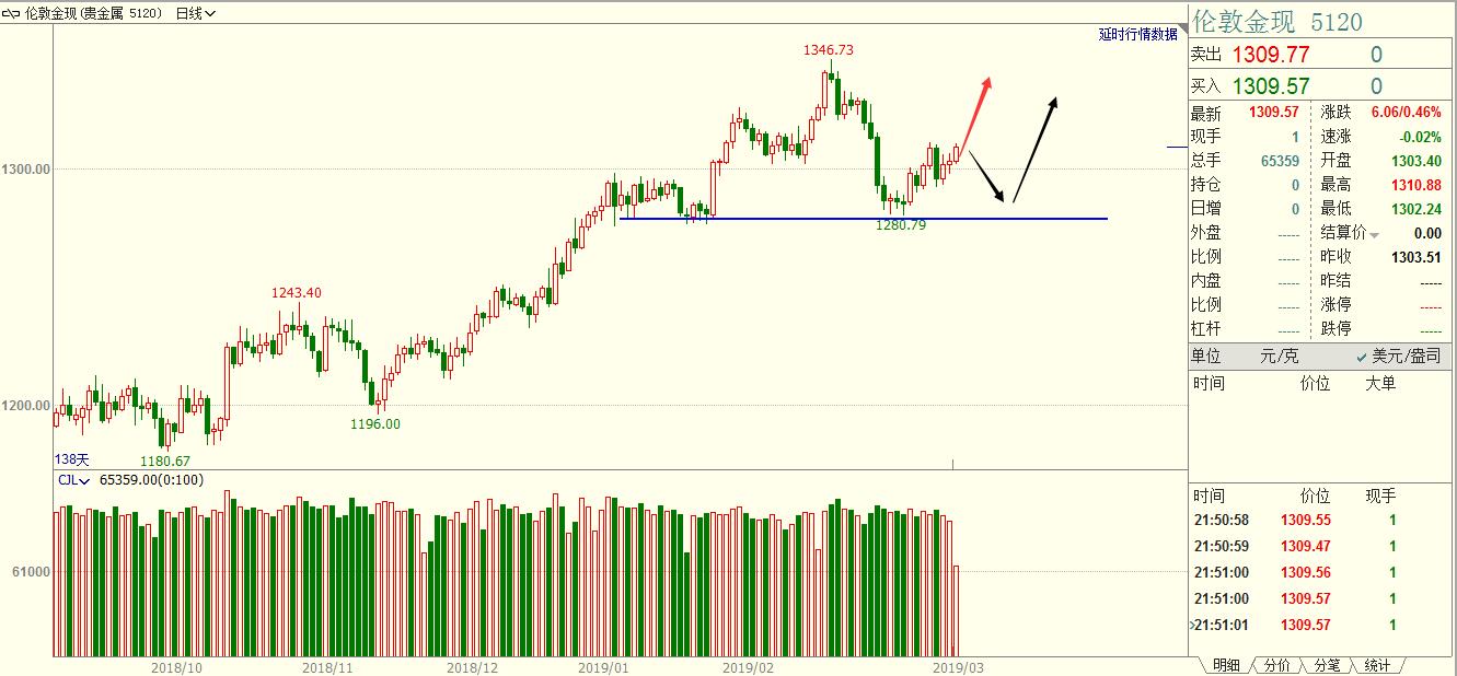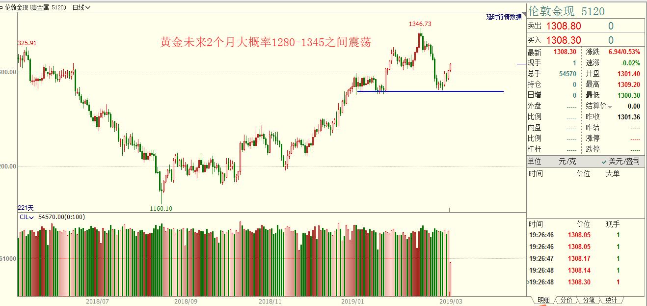 在之前的文章中笔者提示过,黄金去年一波多头趋势走完之后是三个月的宽幅震荡,今年大概率也是如此,只不过黄金的震荡区间压低至1345-1280之间。目前看笔者的分析是对的,虽然当中有波段性做空机会,但第一次确定震荡区间的范围不好把握。 技术上,黄金未来三个月大概率在1280-1345之间维持震荡格局。大方向上,只要不有效跌破1280,黄金都会维持震荡。震荡市中,价格的波动具有随机性,但震荡的节奏隐含着主力资金的意图。 黄金3月1日的大阴线,跌破了整个上涨节奏的趋势线,使趋势交易者从多头转向空头,而金价在1280遇阻之后并没有延续下跌,依靠3月1日大阴线做空