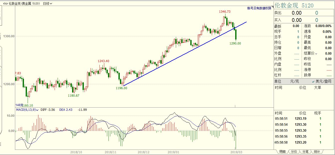 龟兔赛跑的故事众所周知,其踏实和坚持才能成功的寓意绝对是深刻的。不少的投资者是冲着期货市场里的暴富神话而来的,潜意识里或者就直接把自己定义为下一个神话的缔造者。这样的新手,心态上就如自负的兔子。每天满仓地杀进杀出,做着不断有浮盈后加仓的黄粱美梦,颇有“小马乍行嫌路窄,雏鸟初飞怨天低”的味道。市场大部分情况下是平稳波动的,获得暴利很大程度上是因为机遇,而非能力。做交易赚一两次不难,难的是长期获利。 黄金 :隔夜大阴线收盘,跌破了上升趋势线,从去年11月中旬开始的黄金多头随着周五的暴跌,宣告这一波趋势性多头彻底结束。 笔者在2月24号的点评中用黄金40年
