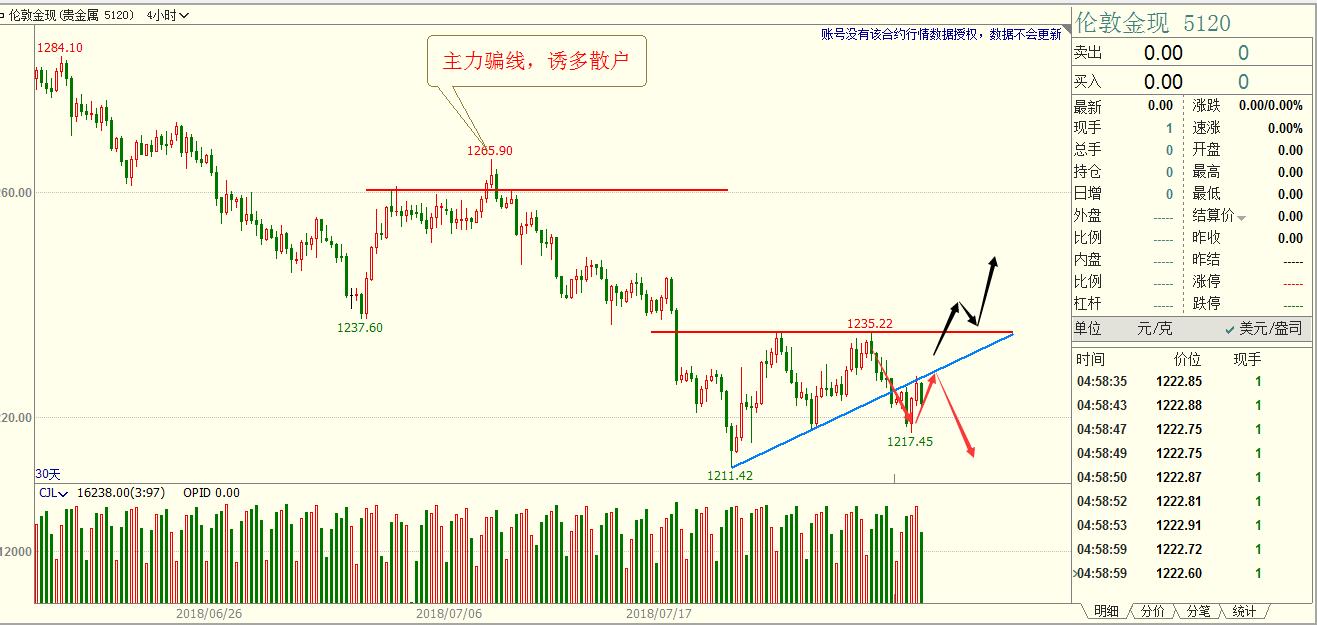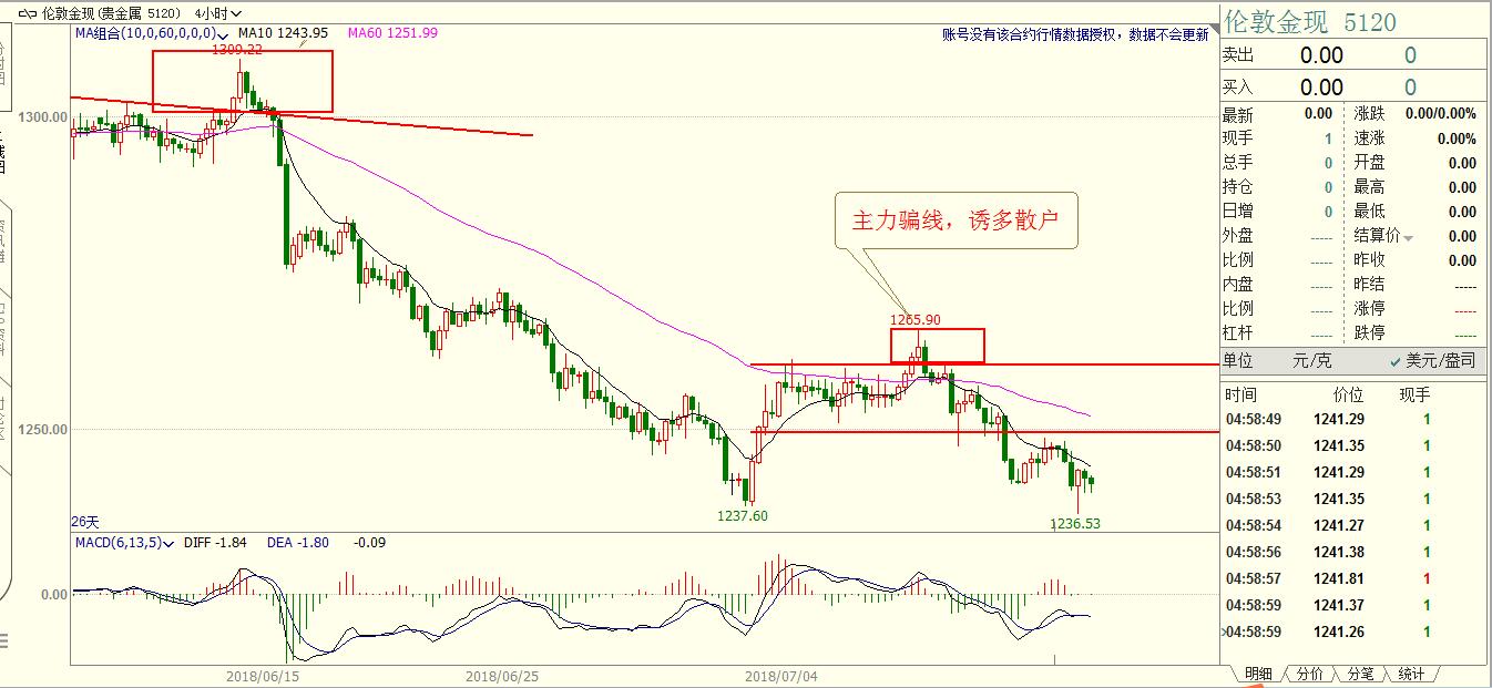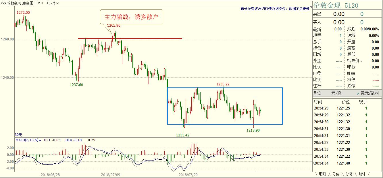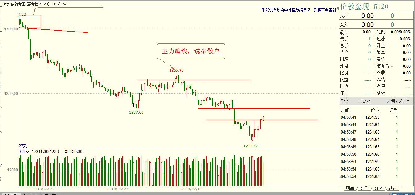 K线,是市场运动最基本的表现符号,它承载着金钱的流动轨迹,记录着金钱的得失过程。它被人们赋予了生命,展示着人们的期望、猜疑、幻想、贪婪、恐惧等,蕴涵着丰富的自然法则。 黄金,周线日线空头趋势,周五晚间把周三晚间的空单止盈离场,距离我们设置的目标位仅差1美金,之后快速反弹,盈利虽有所回吐,加仓空单弥补了一些遗憾。 本周黄金又导演了一次经典的主力骗线,这已经是本轮下跌第三次骗线了。周一的K线图足以吸引跟风盘,大部分多头散户看多,主力收集对手盘筹码,集中进行狙杀,也对前期抄底的散户制造恐慌,意志不坚定的散户交出筹码促使金价进一步下跌。 面