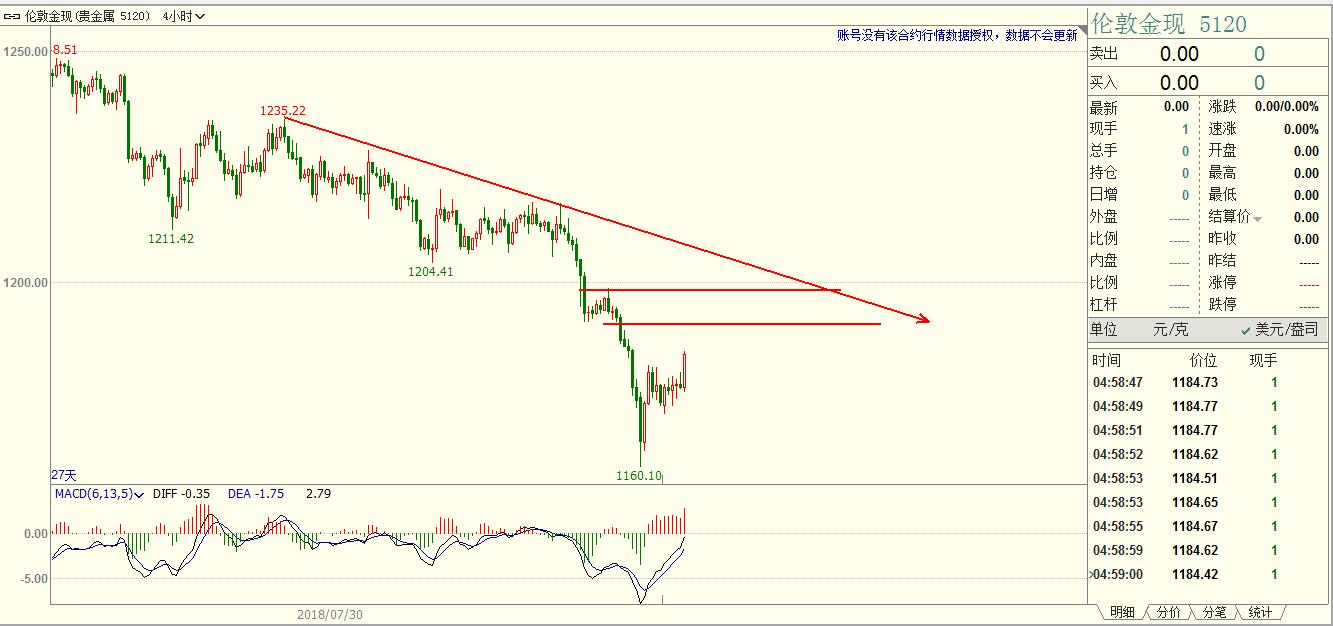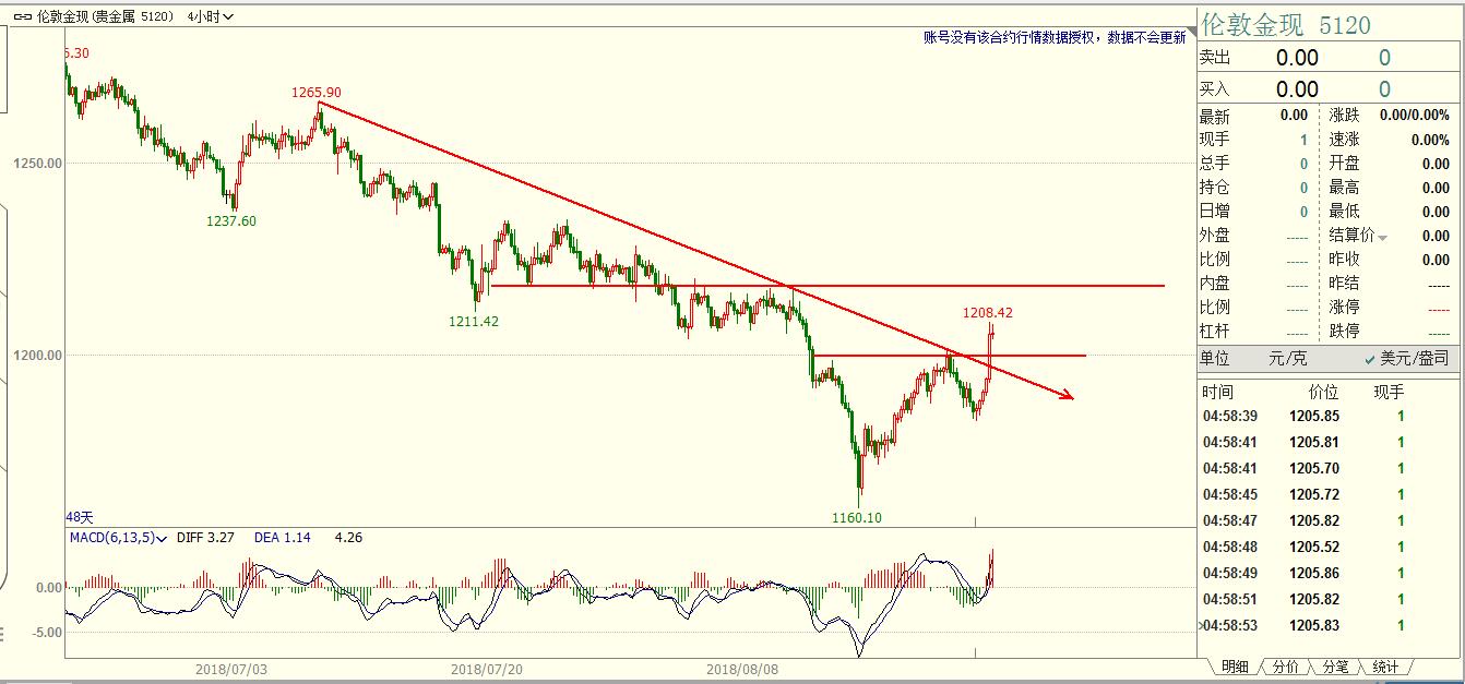 投机成功的最本质要求是什么?五花八门的投资理论和汗牛充栋的投资书籍都给出了各自的回答,我曾经沉湎于这些理论和书籍,试图找到上帝赋予的“金手指”,但最终得到的却只是感到了理论的灰色和苍白。投机远非能理解几本书就能顿悟,他需要和自己的个性相匹配。 本周黄金走的并不顺利,空头趋势的反弹并没有戛然而止,周五晚间美联储主席鲍威尔的偏鸽派言论促使黄金突破1200关口,日线报收大阳线,收盘在日线MA10上方。黄金自1160反弹以来,到目前位置足有40美金,超过了正常的反弹空间,能否反转还需要时间验证。毕竟周线上,黄金还是空头趋势。 黄金,4H图表上,突破了下降趋势线,收盘