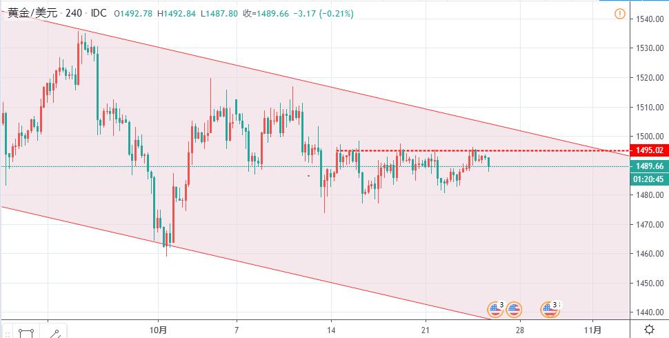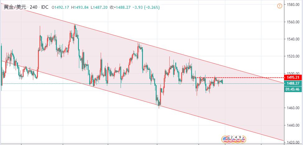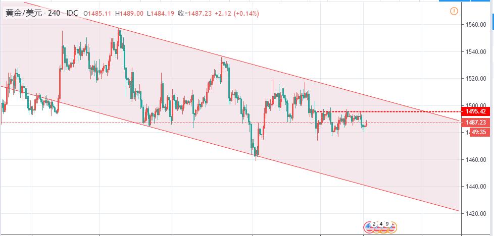 你如果还是不能彻底地放过那些不属于你交易系统的机会,还是用侥幸寻找着成功,那么你将永远找不到成功。 而只有彻底的放弃,彻底的遵守,彻底的执行,才是你走向成功的唯一选择! 黄金:日线震荡市,震荡是比较难做的,跌的好好的可能瞬间就来上去了,涨的好好的可能一根大阴线就砸下来了,操作的难度比较大,其实震荡市可以舍弃,除非你的强项就是做震荡。 黄金4H图上,价格在1495-1480之间震荡,上方收盘价站不上1495,,下方收盘价跌不破1480,目前就在这个箱体之间来回拉锯,如果要操作,中间的价格尽量别动,操作上尽量快进快出,不要恋战。